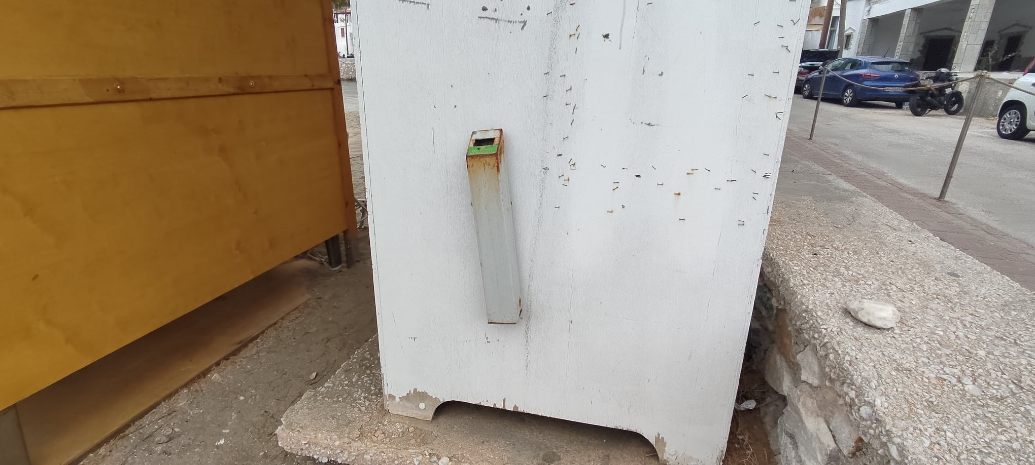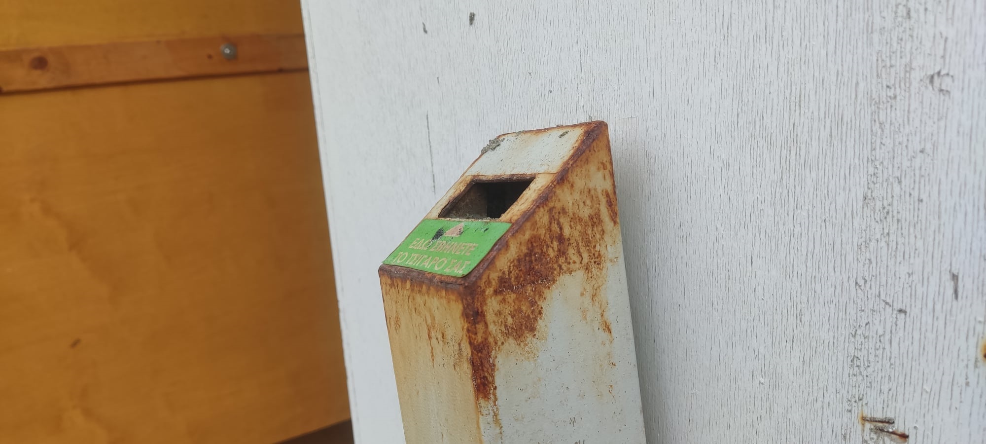 Ειδικότερα, οι μικροί κάδοι στο εσωτερικό των οποίων οι καπνιστές μπορούσαν να εναποθέσουν τις γόπες τους, έχουν σκουριάσει σχεδόν σε όλες τις επιφάνειες τους, αποκτώντας μάλιστα και τρύπες σε ορισμένα σημεία, με αποτέλεσμα, να έχουν αχρηστευθεί.