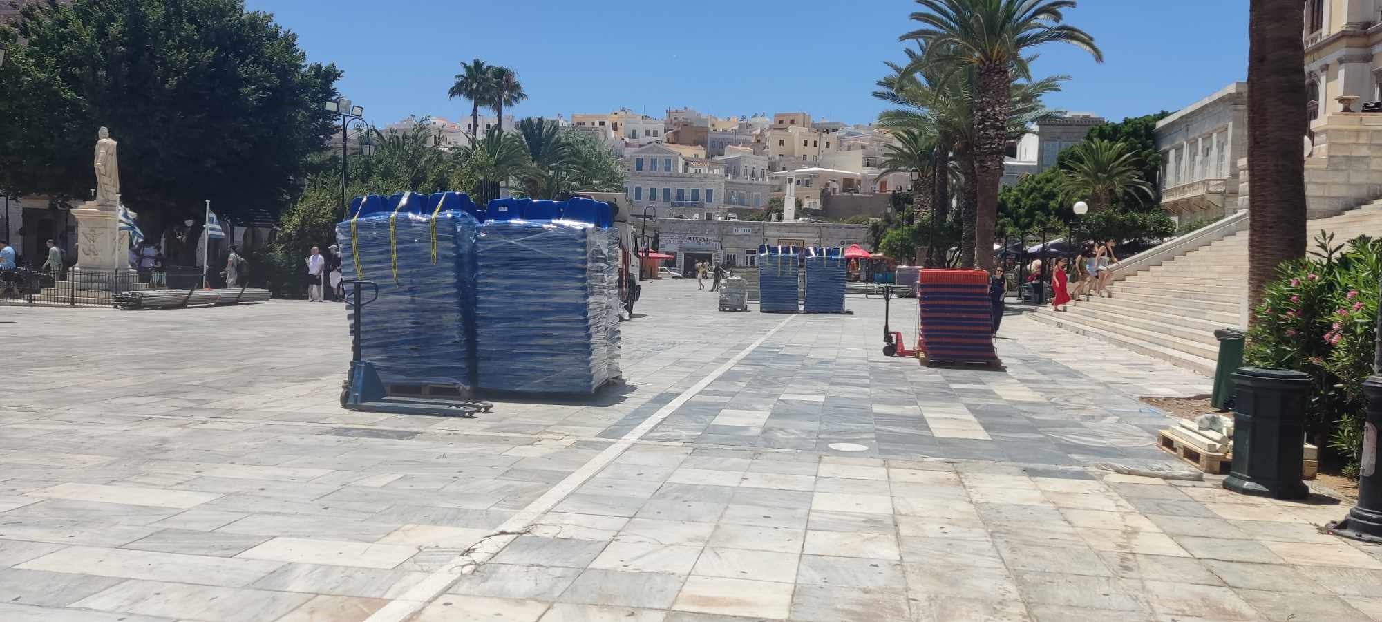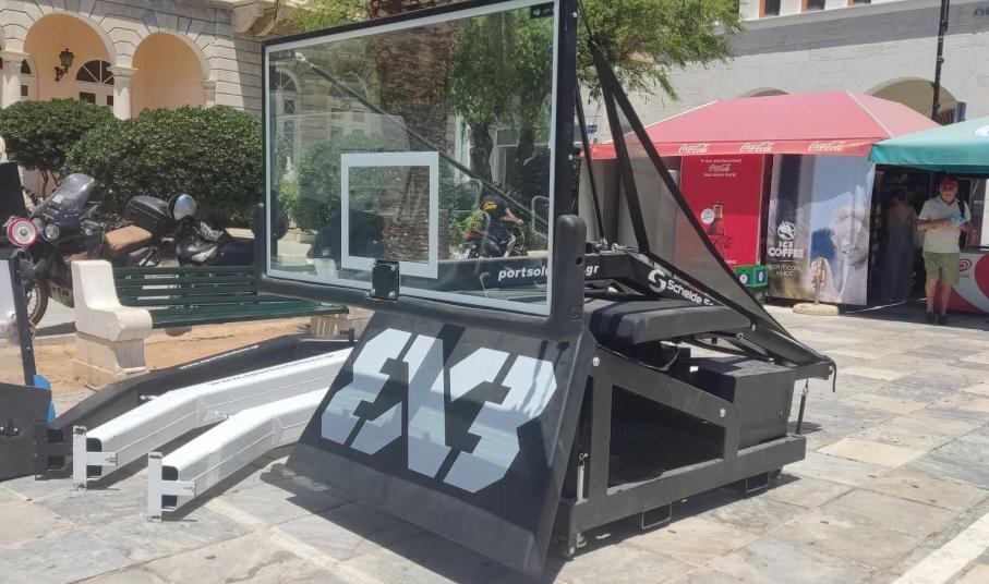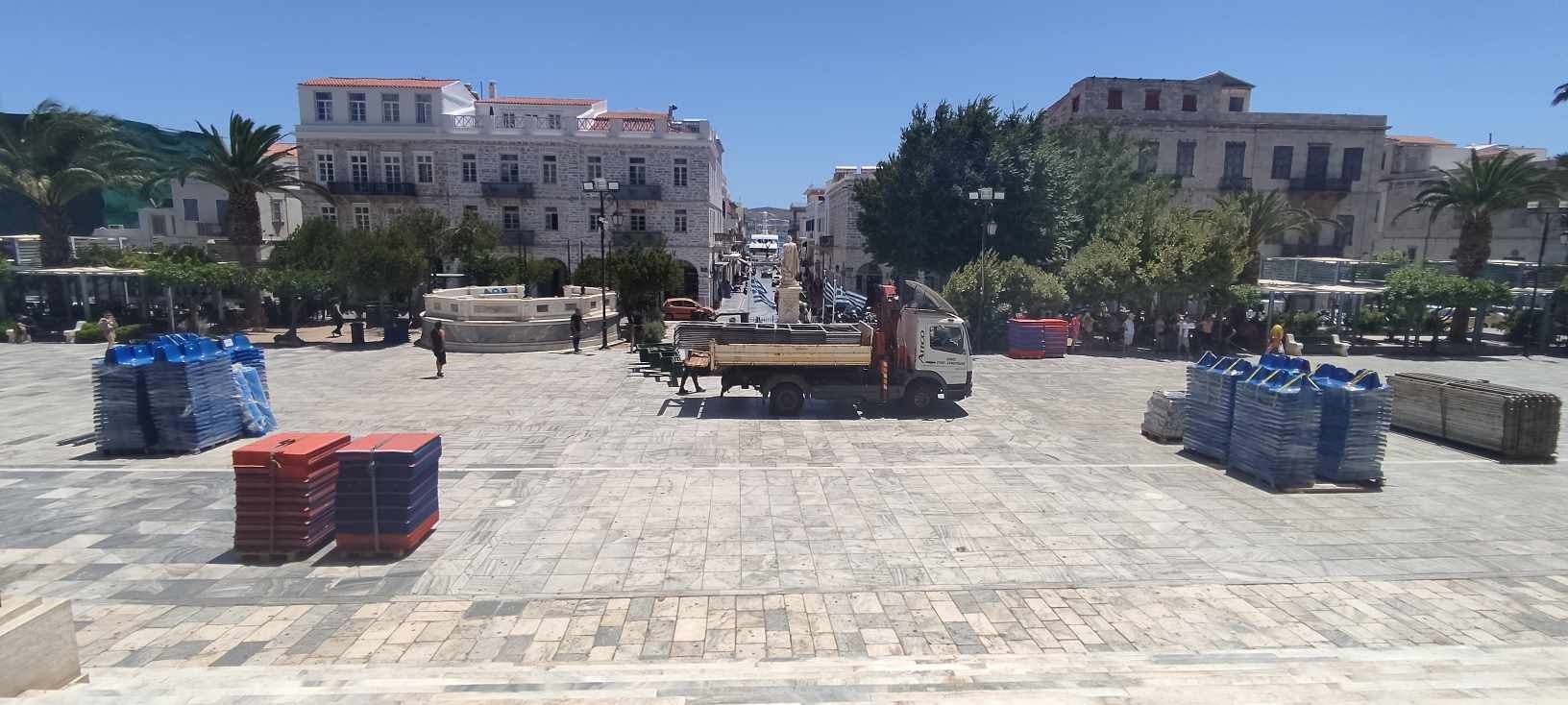 Από χθες, το μεσημέρι άρχισε η μεταφορά όλου του εξοπλισμού που είναι απαραίτητος για να “μεταμορφωθεί” η πλατεία Μιαούλη σε μπασκετικό χώρο, με τα απαιτούμενα συνεργεία να δουλεύουν συστηματικά για τη διαμόρφωση των γηπέδων. Κερκίδες, μπασκέτες, υποστυλώματα για τα καθίσματα αλλά και όσα άλλα χρειάζονται για την ομαλή και ασφαλή διεξαγωγή του, γέμισαν την πλατεία Μιαούλη.