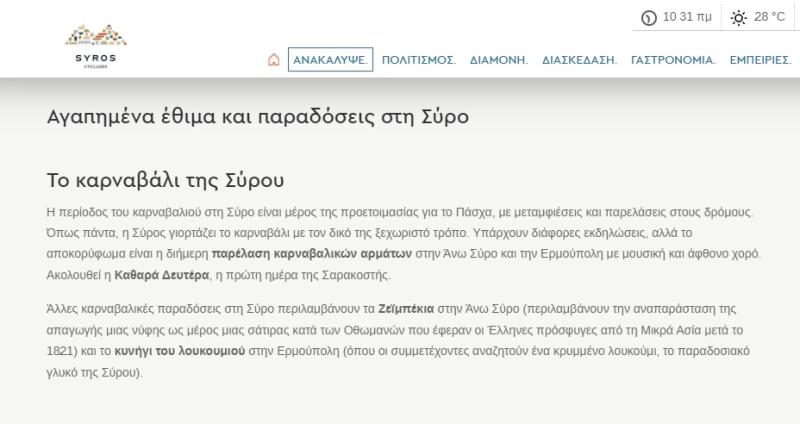 Η “Κοινή Γνώμη” παρουσιάζει ορισμένες εικόνες από το τουριστικό portal, στις οποίες μέχρι και χθες αποτυπώνονταν λανθασμένα κάποια στοιχεία. Ενδεικτικά, πρέπει να αναφερθεί πως είναι ανεπίκαιρος ο κατάλογος των επιχειρήσεων, αφού περιλαμβάνονται μέσα σε αυτόν ακόμη και κλειστές επιχειρήσεις, οι αναφορές για το Καρναβάλι είναι φτωχές, υπάρχει σύγχυση για ναούς όπως του Αγίου Γεωργίου στην Ερμούπολη και του Αγίου Γεωργίου – που είναι καθεδρικός των Καθολικών – στην Άνω Σύρο, ενώ σε τουριστικά καταλύματα λείπει φωτογραφικό υλικό.