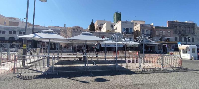 Στην πάκτωση των ομπρελών στον επιπλέον χώρο αναμονής επιβατών στο λιμάνι της Ερμούπολης, προχώρησαν χθες εργάτες, σε συνέχεια απόφασης του Λιμενικού Ταμείου Σύρου, για την ασφάλεια των πολιτών που ταξιδεύουν με πλοία από τη Σύρο.