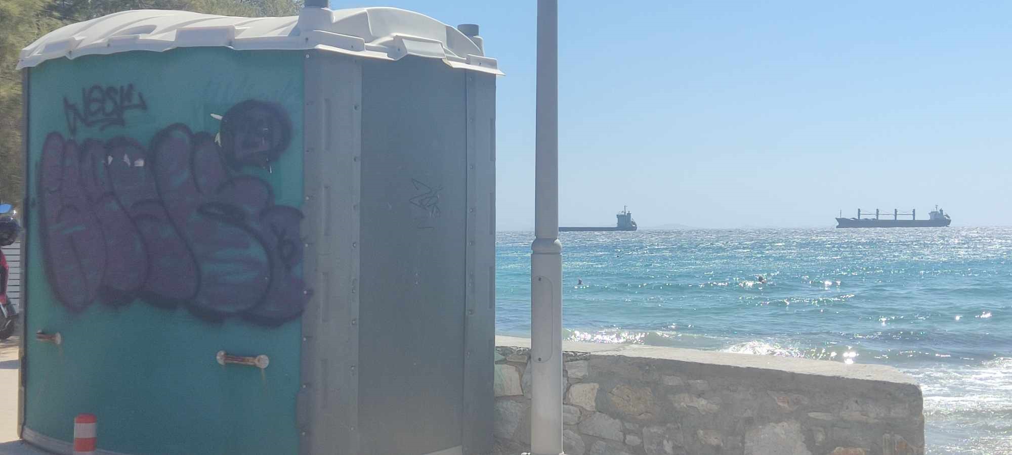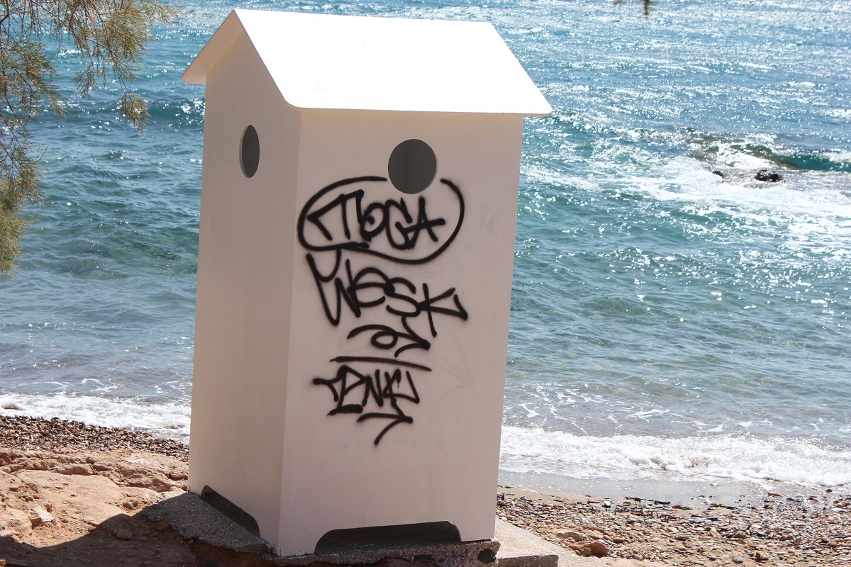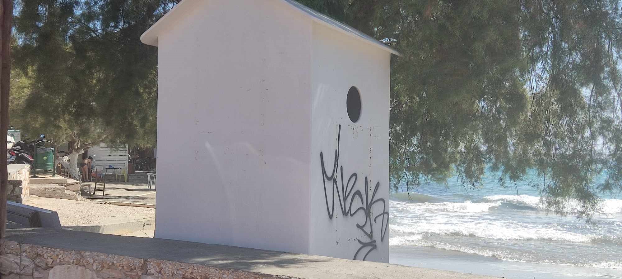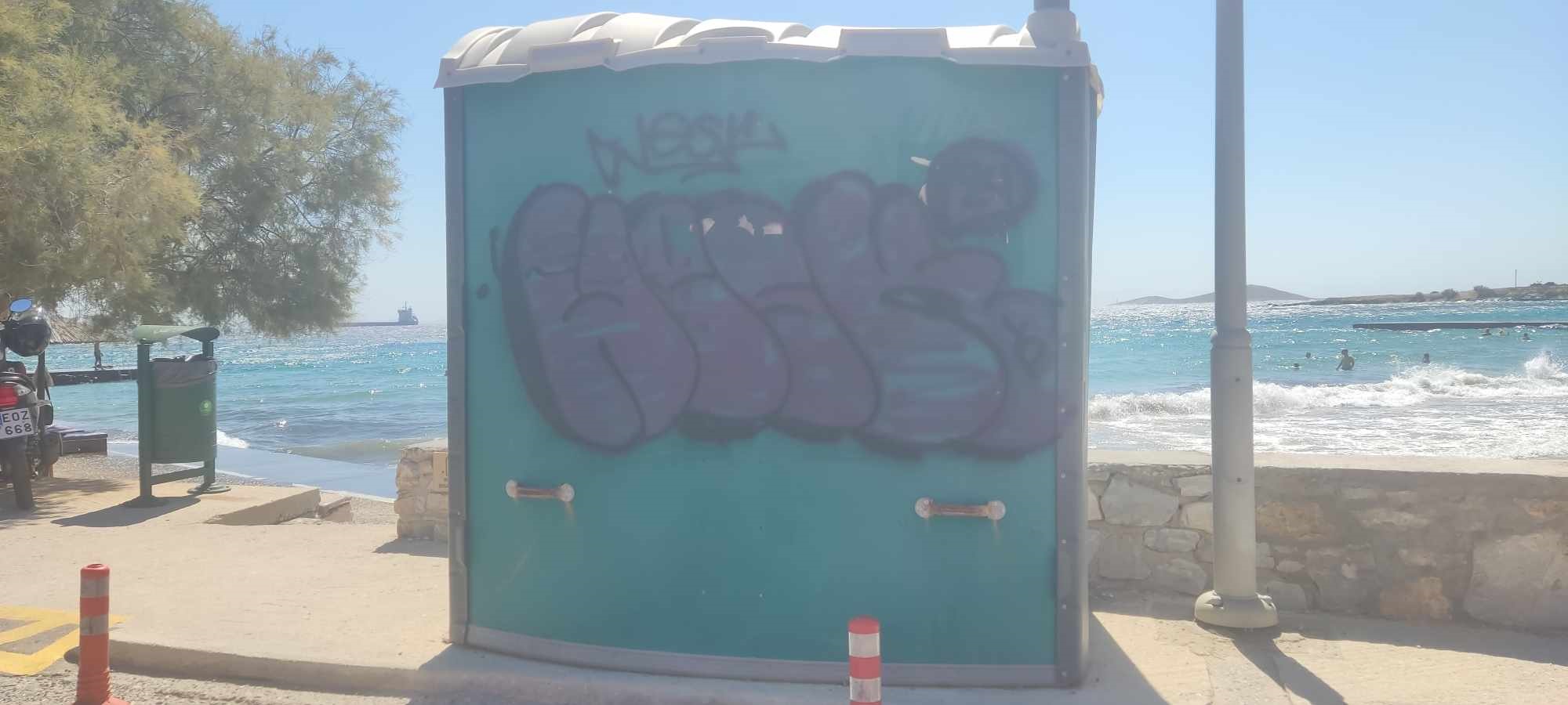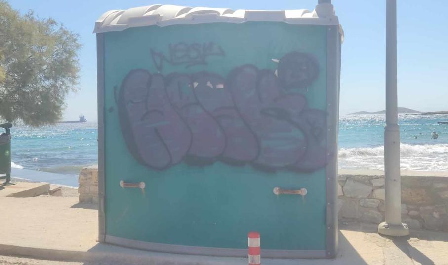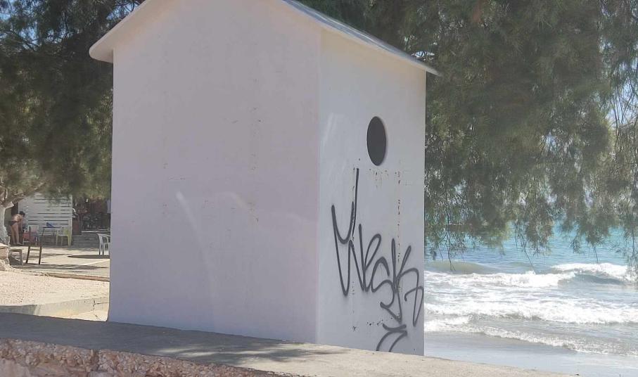Όπως φαίνεται, στην Αζόλιμνο υπήρξαν ασυνείδητοι που γέμισαν με γκράφιτι τόσο τις τουαλέτες για τα ΑΜΕΑ, όσο και τα λευκά αποδυτήρια, με αποτέλεσμα να υποβαθμίζουν αισθητικά την εικόνα των παραλιών.