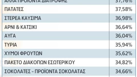 Ακολουθούν τα νωπά λαχανικά με αύξηση 38,57%, οι πατάτες στο 37,58%, καθώς και το αρνί και το κατσίκι που έχουν ακριβύνει κάτι περισσότερο από 36%. Αν αναζητήσει κάποιος τον κατάλογο με τα προϊόντα που έγιναν φθηνότερα μέσα στην τελευταία τριετία, θα βρει τις υπηρεσίες internet όπου είχαμε πτώση τιμής κατά 5%, τις υπηρεσίες κινητής τηλεφωνίας που επίσης υποχώρησαν με ανάλογο ποσοστό, διάφορες συσκευές και μουσικά όργανα, τα λογοτεχνικά βιβλία κ.λπ. Δηλαδή, μειώσεις σε είδη μαζικής κατανάλωσης -με εξαίρεση τις επικοινωνίες- δεν εντοπίζονται στον σχετικό πίνακα της τριετίας, κάτι που προφανώς αυξάνει τη δυσαρέσκεια για το πρόβλημα της ακρίβειας.
