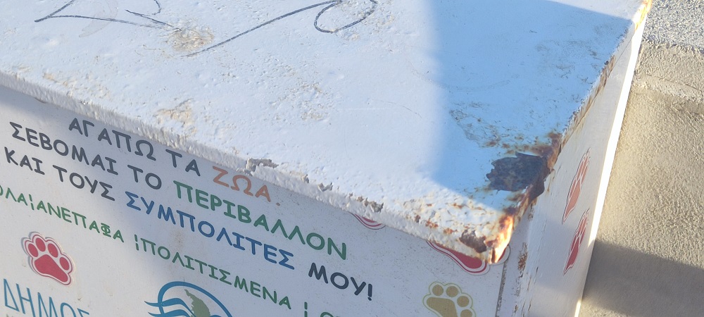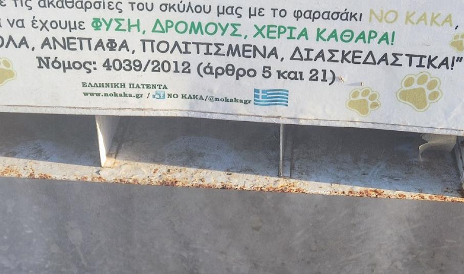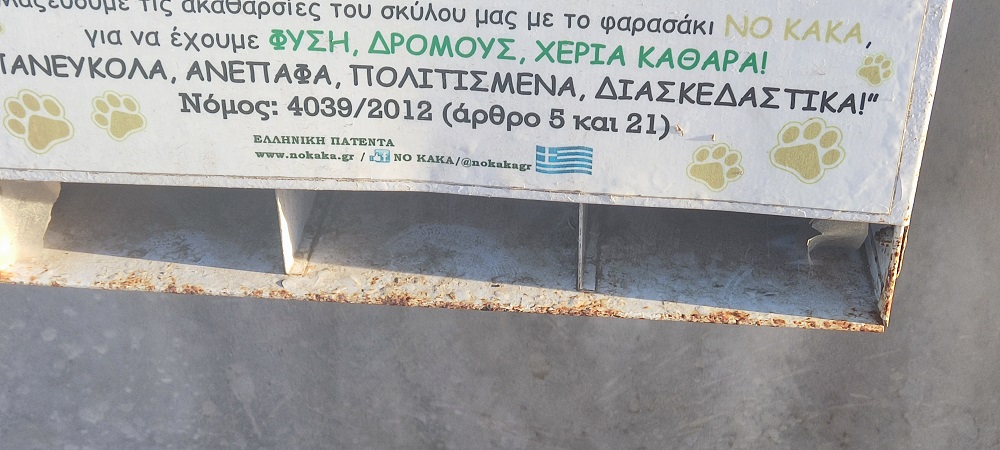 Συγκεκριμένα, το ένα κυτίο NO KAKA που είχε τοποθετηθεί κατά το παρελθόν, φέρει σημαντικές φθορές και έχει σκουριάσει, ενώ δυστυχώς, επί πολλούς μήνες δεν διαθέτει τα ειδικά φαρασάκια για την απομάκρυνση των περιττωμάτων των κατοικίδιων ζώων. Ο Δήμος οφείλει να μεριμνήσει για τη συνέχιση της δράσης, όπως παρομοίως για τη συντήρηση και του μικρού κάδου ανακύκλωσης αποτσίγαρων ώστε να “υπηρετεί” τον ρόλο του και να εναποθέτουν οι πολίτες τις γόπες τους.