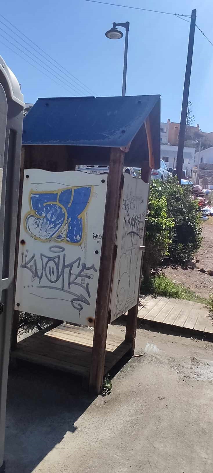 Η ίδια εικόνα εντοπίζεται και στις τέσσερις “εισόδους” της παραλίας, ενώ επιπλέον, οι καμπίνες δεν καθαρίστηκαν από τα γκράφιτι.