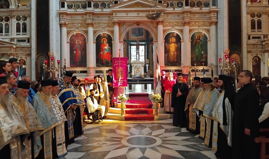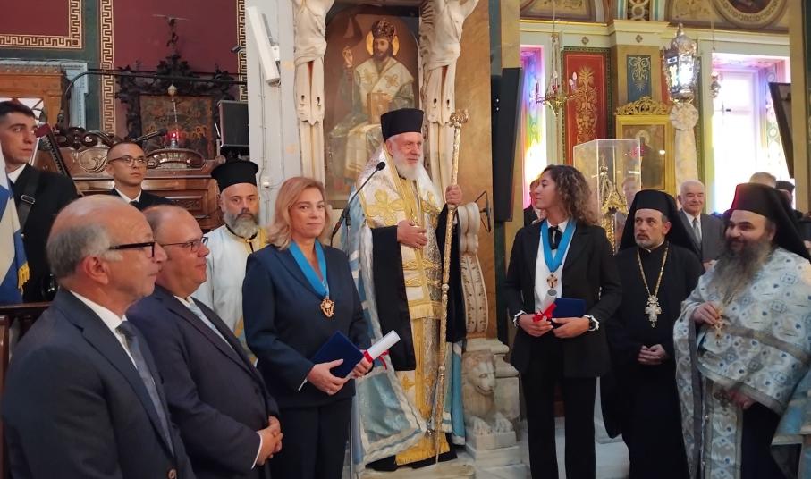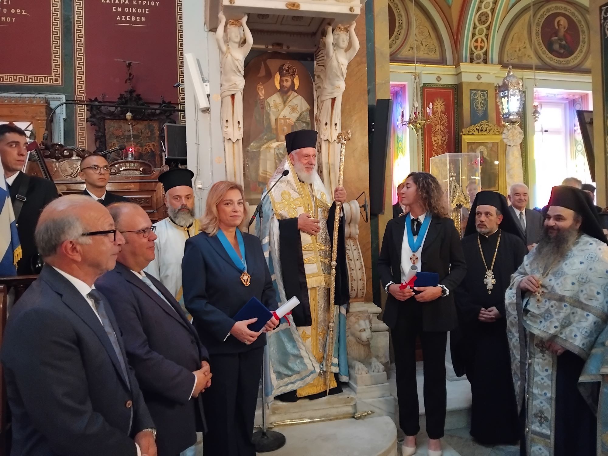 Λίγο πριν την ολοκλήρωση της επίσημης δοξολογίας, ο μητροπολίτης Σύρου, τίμησε με ειδικό μετάλλιο, το οποίο δημιουργήθηκε με αφορμή τα 200 χρόνια από την οικοδόμηση του μητροπολιτικού ναού της Μεταμορφώσεως του Σωτήρος, τις δύο ολυμπιονίκες, Άγη Κασούμη και Μιλένα Κοντού, οι οποίες βρέθηκαν στη Σύρο, με αφορμή την επίσκεψη του αναπληρωτή υπουργού Αθλητισμού, Γιάννη Βρούτση.