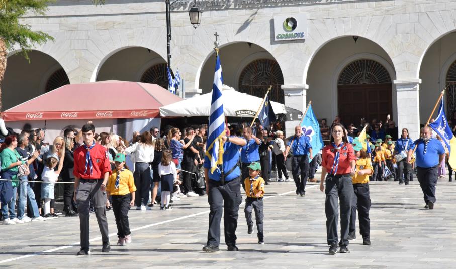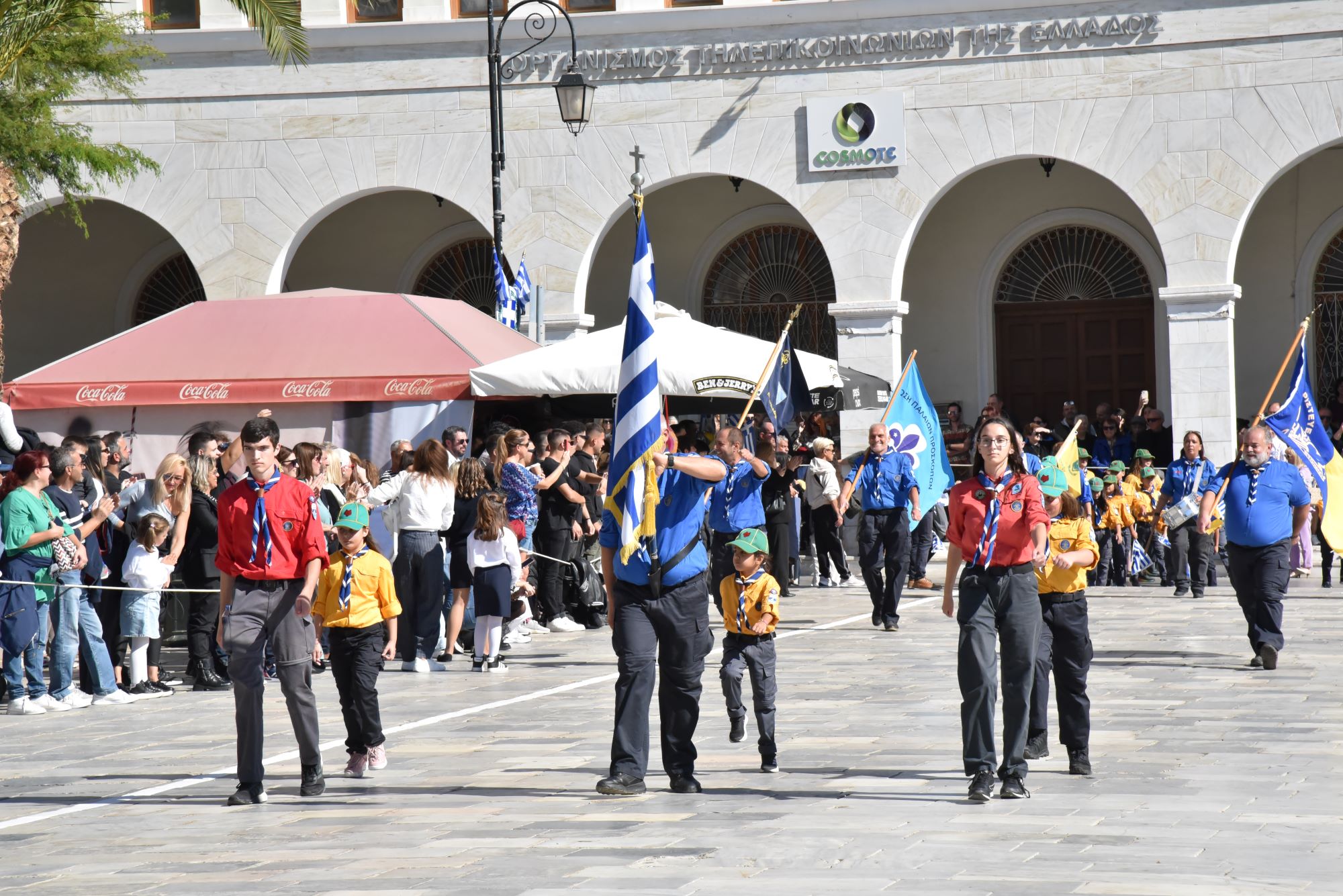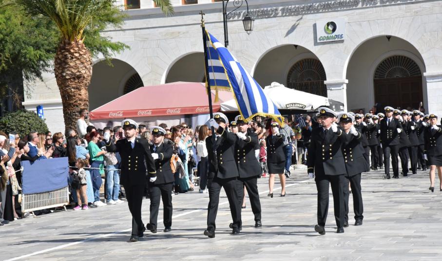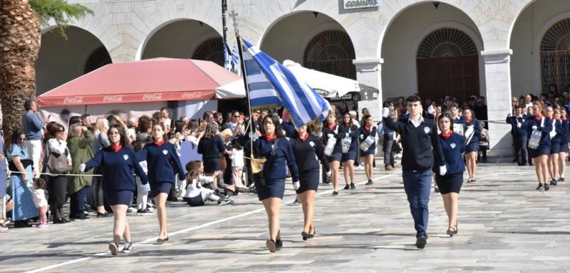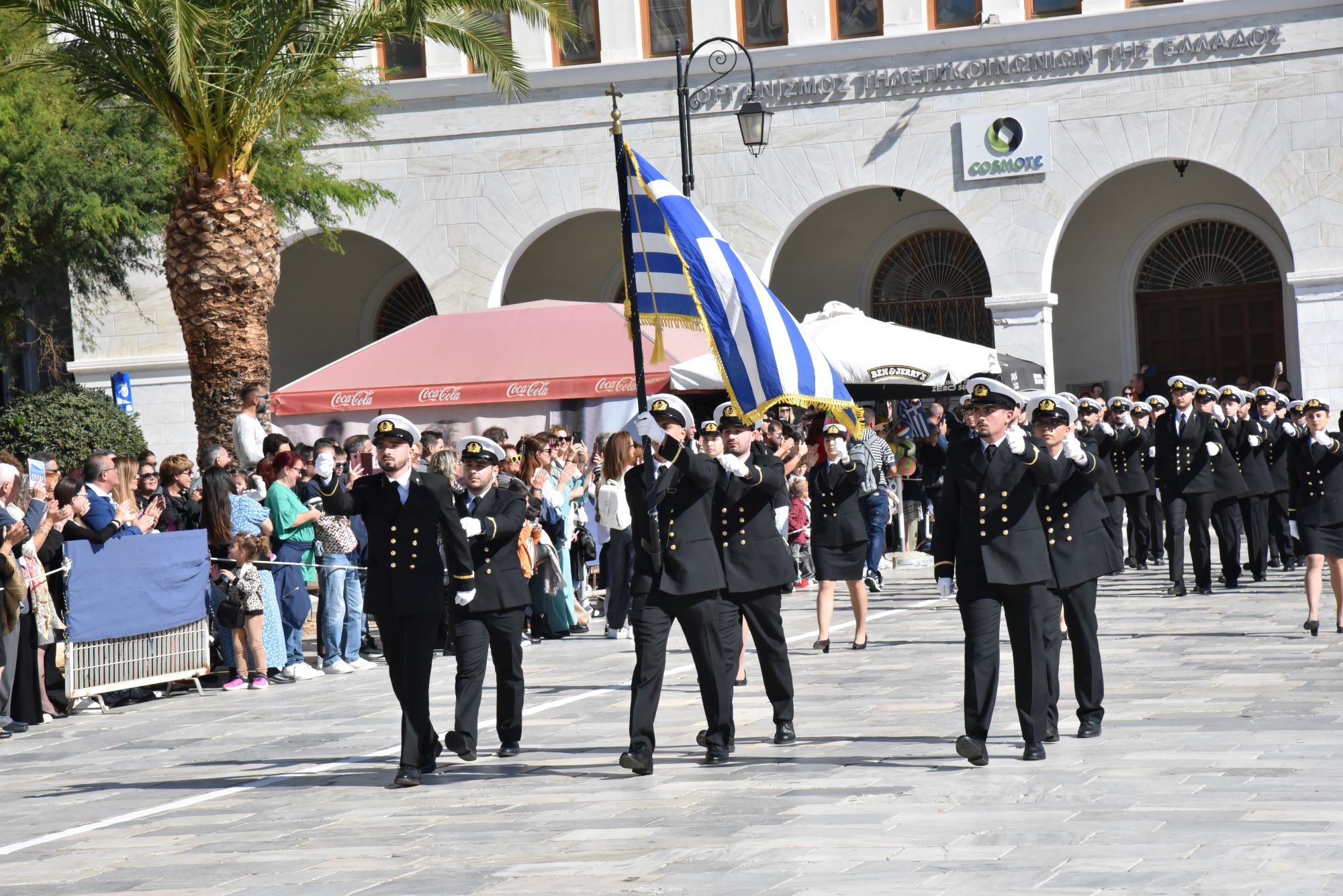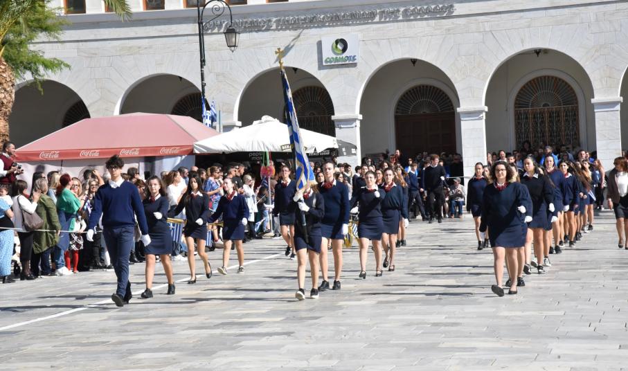 Με υπερηφάνεια παρέλασαν χθες οι μαθητές και οι μαθήτριες των σχολείων, στην πλατεία Μιαούλη της Σύρου, στο πλαίσιο των εορτασμών της 28ης Οκτωβρίου, με το πλήθος που ήταν συγκεντρωμένο να τους δίνει το πιο ζεστό τους χειροκρότημα.