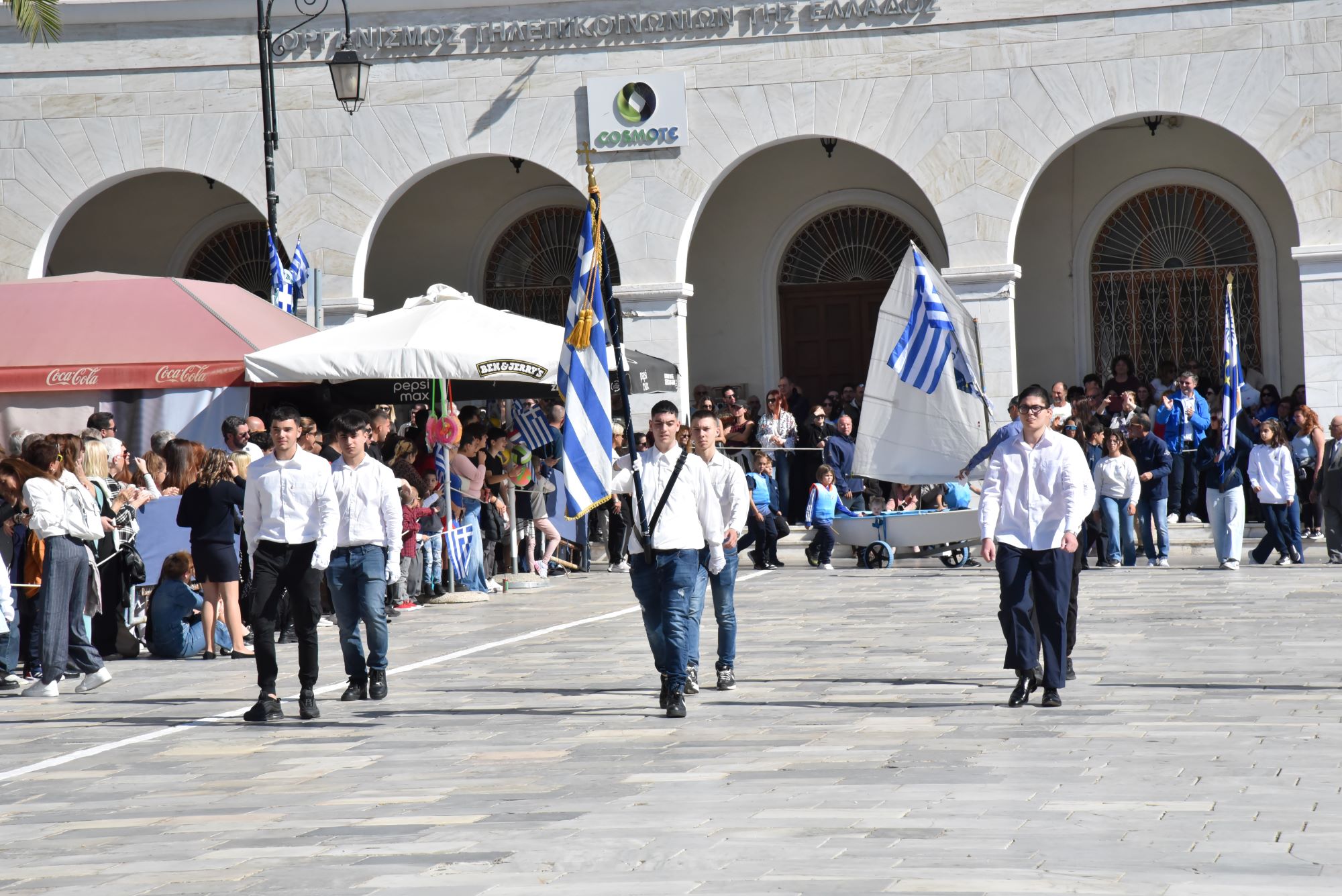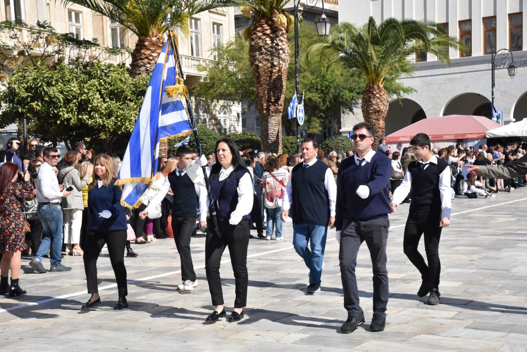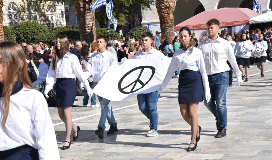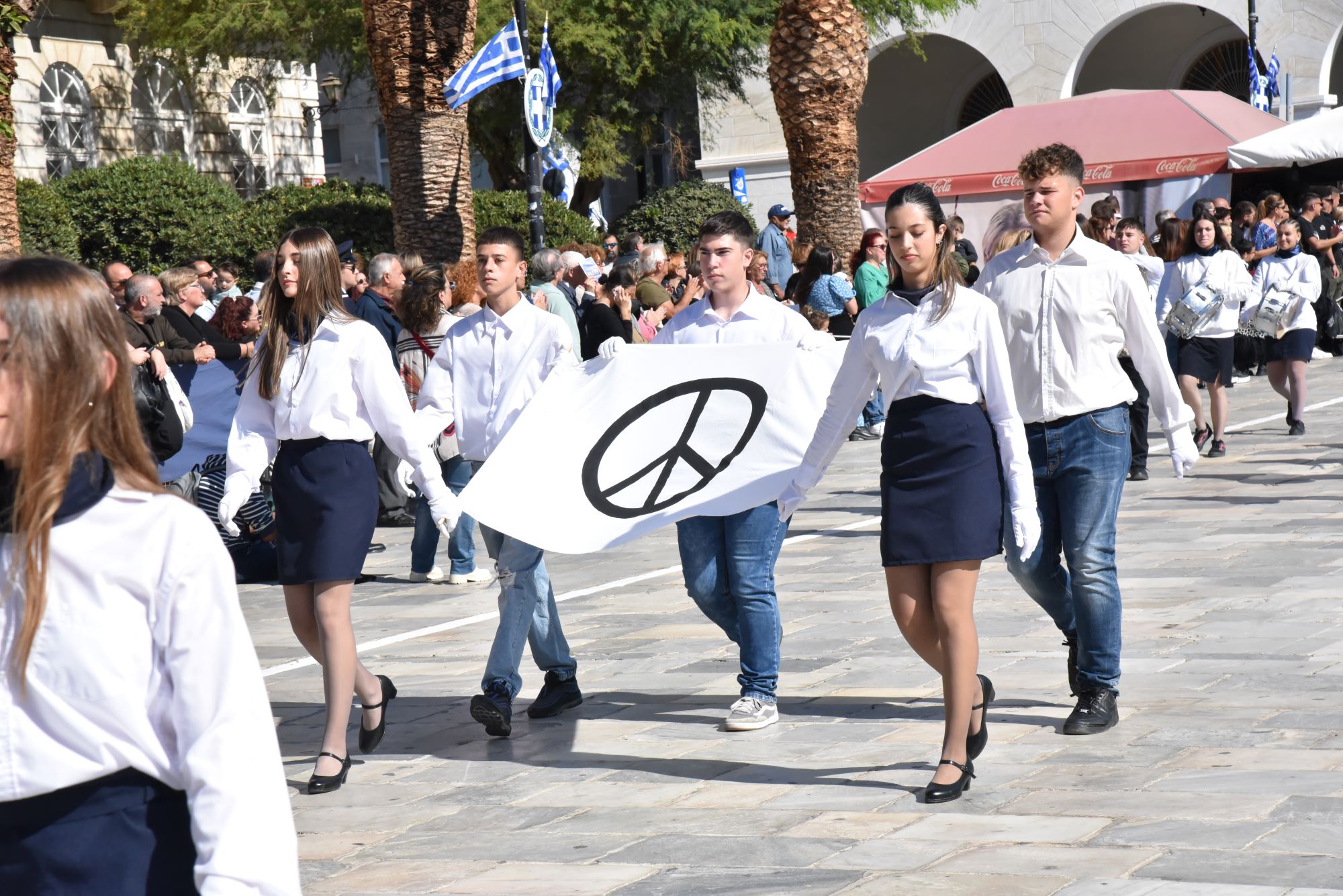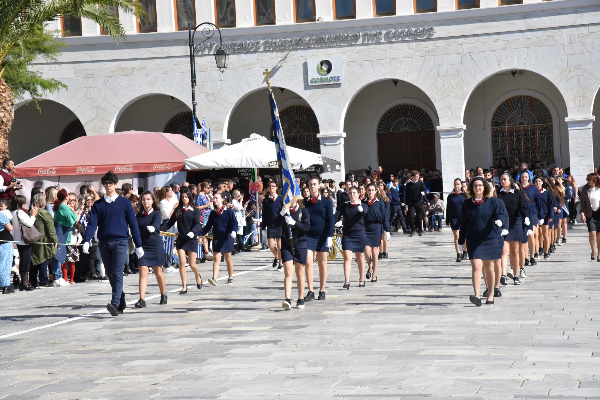Μαθητές και μαθήτριες από όλες τις βαθμίδες της εκπαίδευσης, με συγχρονισμένο βηματισμό τίμησαν τη θυσία των Ελλήνων πεσόντων, υπό τους ήχους των εμβατηρίων από τη Φιλαρμονική του Δήμου Σύρου-Ερμούπολης.