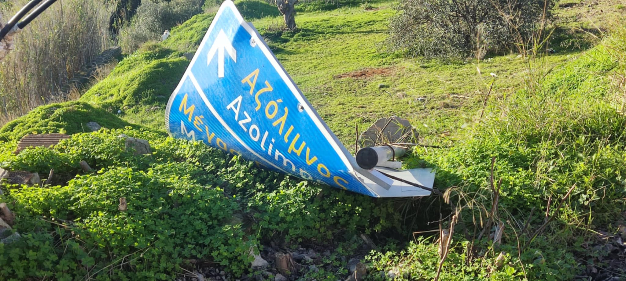 Στο περιθώριο του δρόμου που οδηγεί προς την παράκαμψη της Αζολίμνου, παραμένει μεγάλη ενημερωτική πινακίδα, καθώς οι αρμόδιοι δεν έχουν φροντίσει για την επανατοποθέτησή της, στη βάση της.