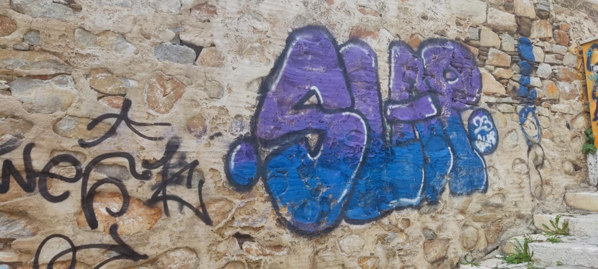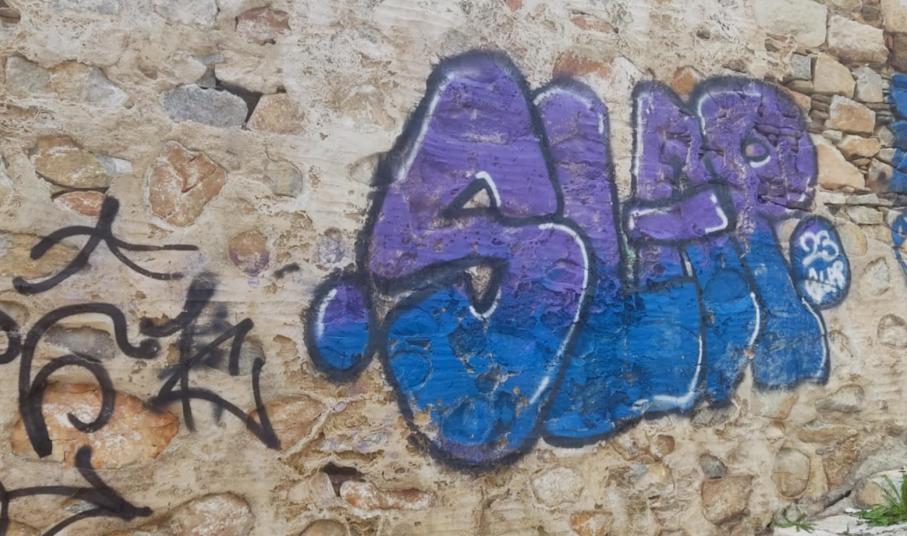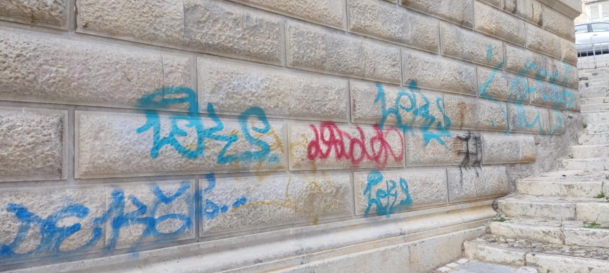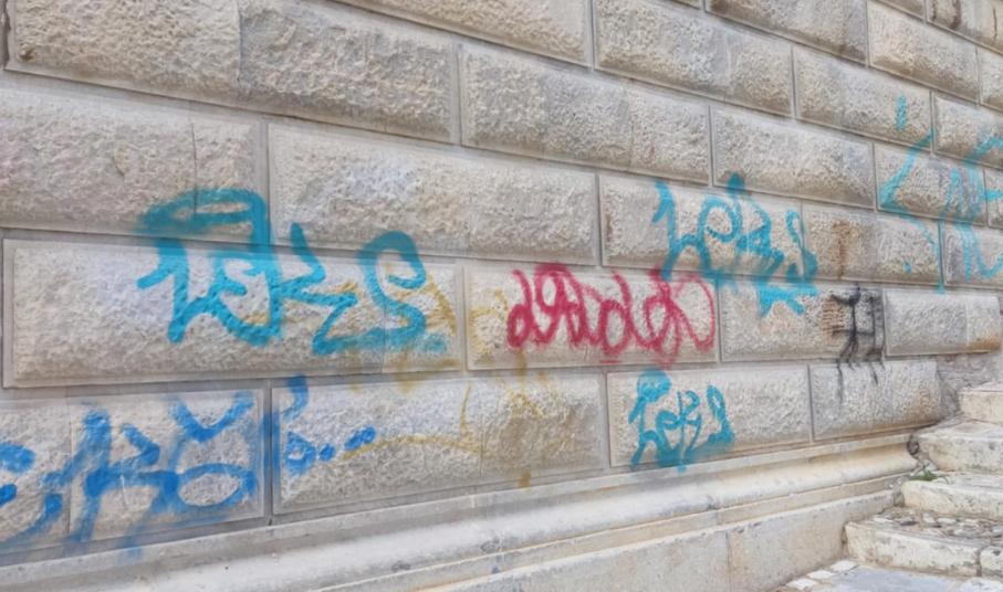 Όπως όλα δείχνουν, προκλητικότατα ασυνείδητοι εισέρχονται στο “κλειστό” κομμάτι του πεζόδρομου, μεταξύ Δημαρχείου και Δημοτικής Βιβλιοθήκης, βάφοντας με σπρέι μεγάλες επιφάνειες των εξωτερικών όψεών του.
