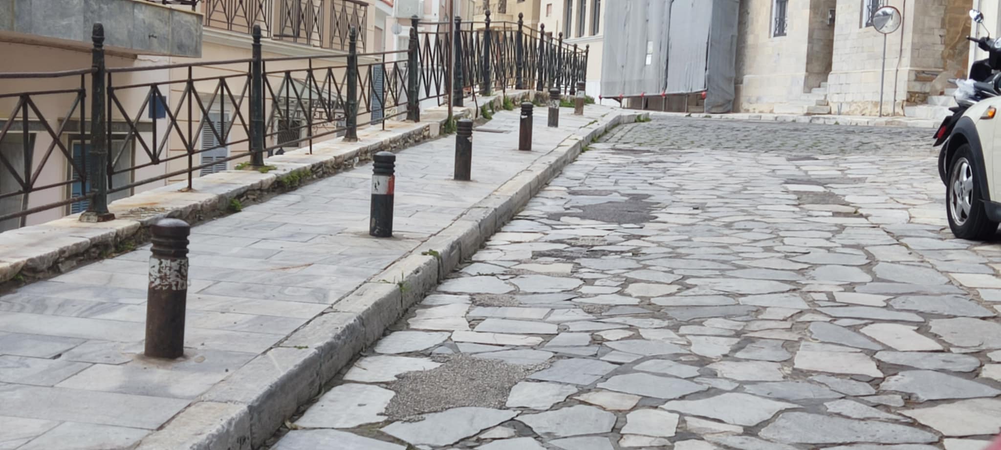 Αν και σαφώς ο δρόμος δεν μπορούσε να αφεθεί με λακκούβες που δημιουργούσαν οι φθορές στις πλάκες και τα σπασμένα μάρμαρα, ωστόσο, δυστυχώς, η “επούλωση” των κενών, δεν γίνεται με τον κατάλληλο και ορθό τρόπο.