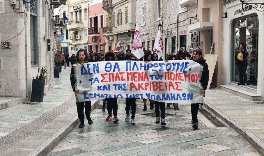 Με πορεία στο κέντρο της Ερμούπολης, πολίτες - που συμμετείχαν στη χθεσινή πανελλαδική απεργία -, στο νησί της Σύρου, φώναξαν συνθήματα κατά της πολιτικής που όπως ανέφεραν “γεννά” πολέμους, φτώχεια, ακρίβεια και συγκάλυψη.