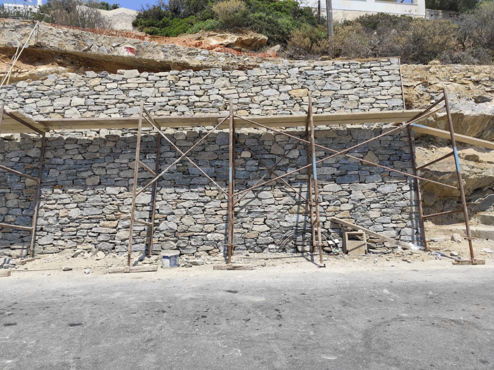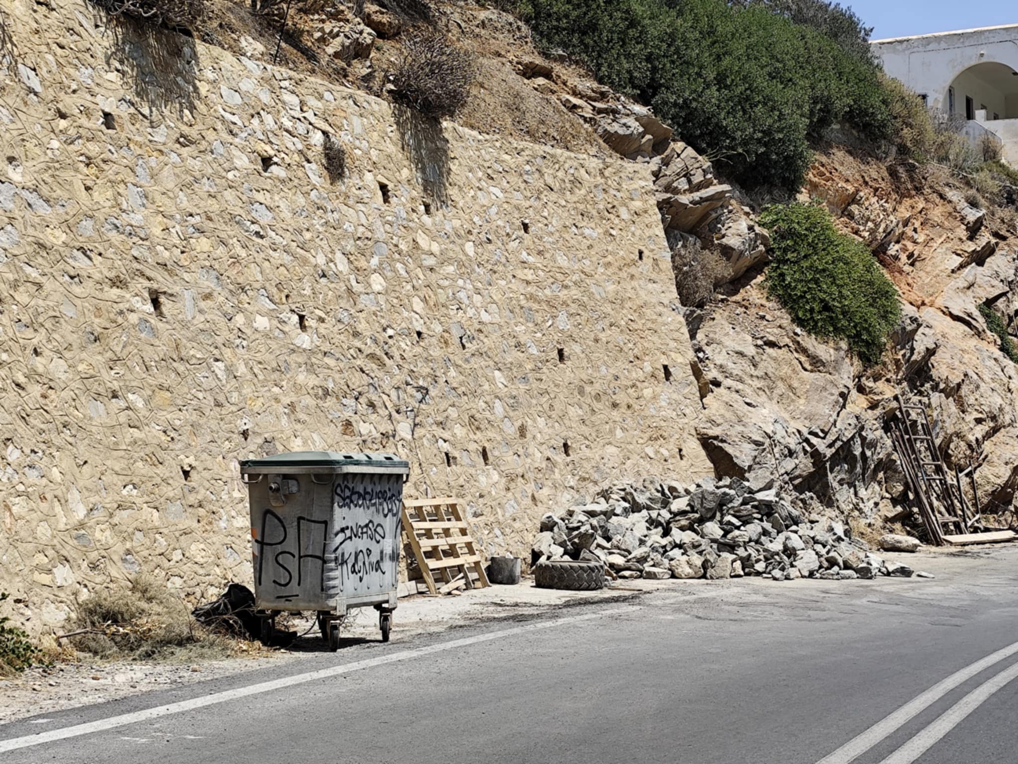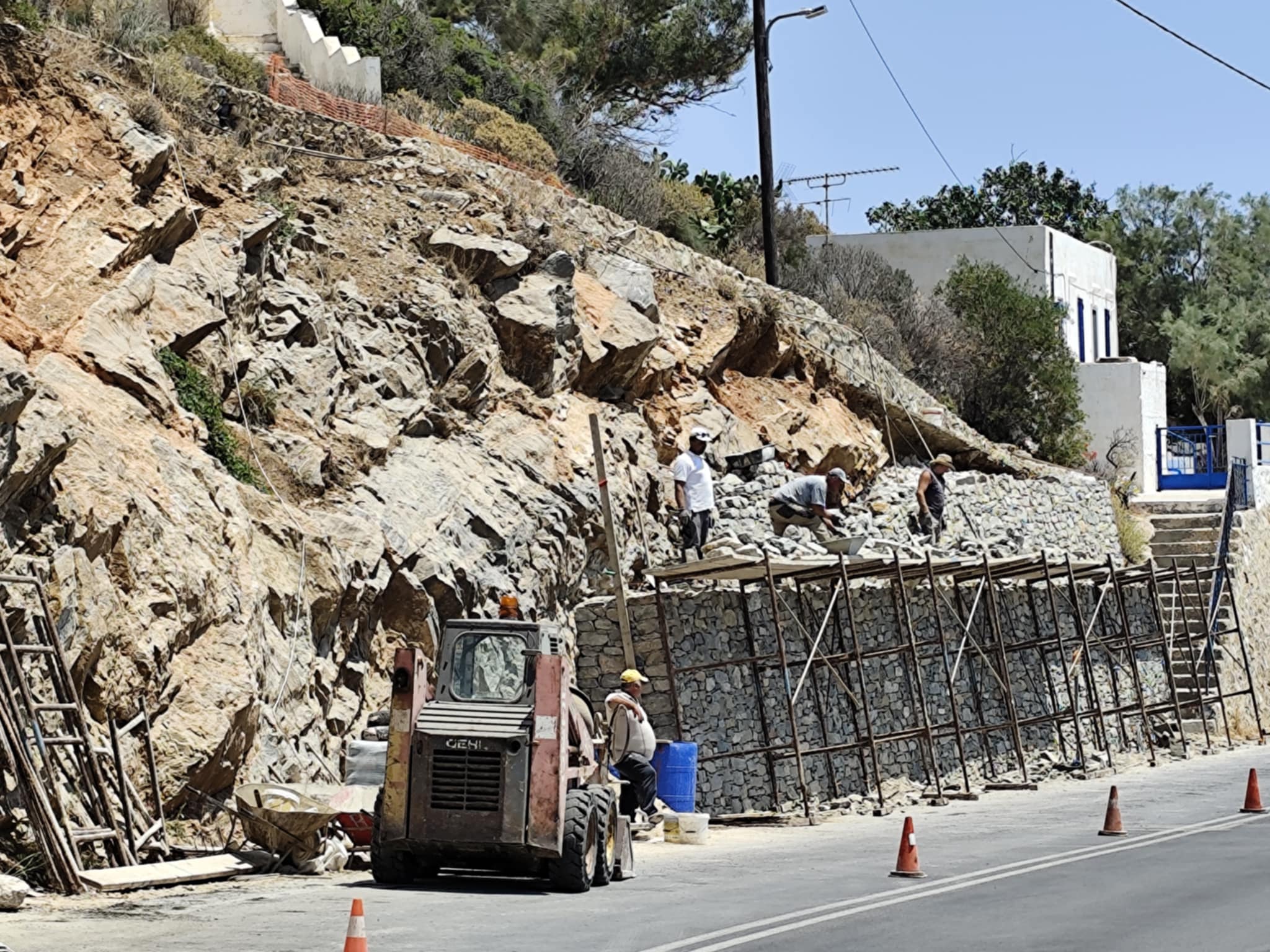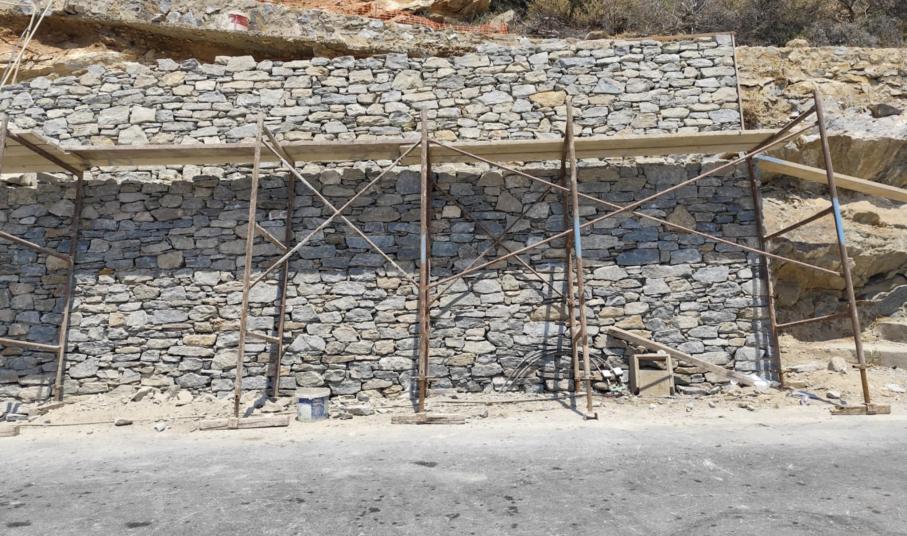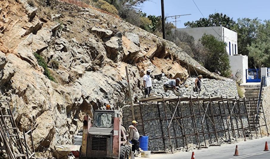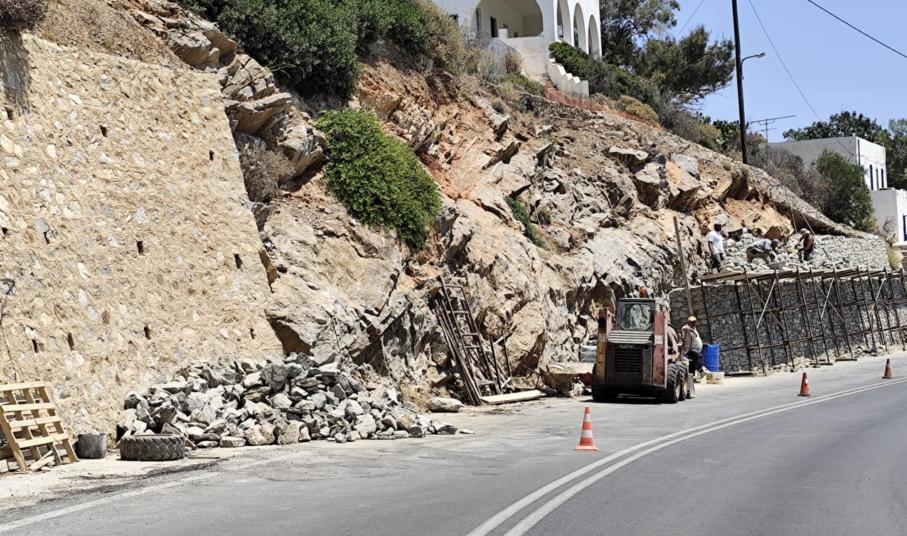 Ειδικότερα, η Περιφέρεια Ν. Αιγαίου με εργολαβία της προχώρησε αρχικά σε εργασίες σταθεροποίησης του πρανούς και στη συνέχεια στη διαμόρφωση τοιχίου, ώστε να προστατεύονται πεζοί και οδηγοί.