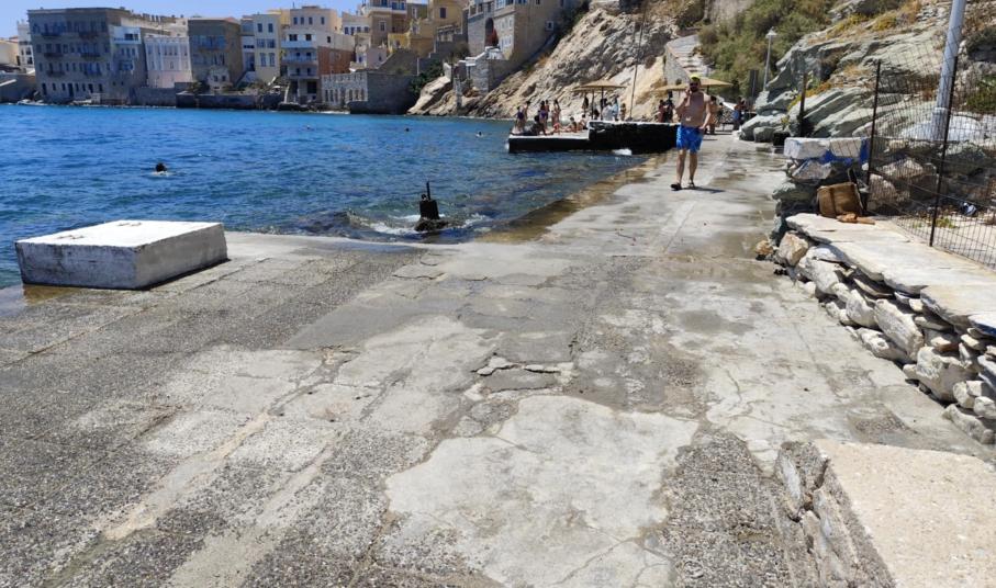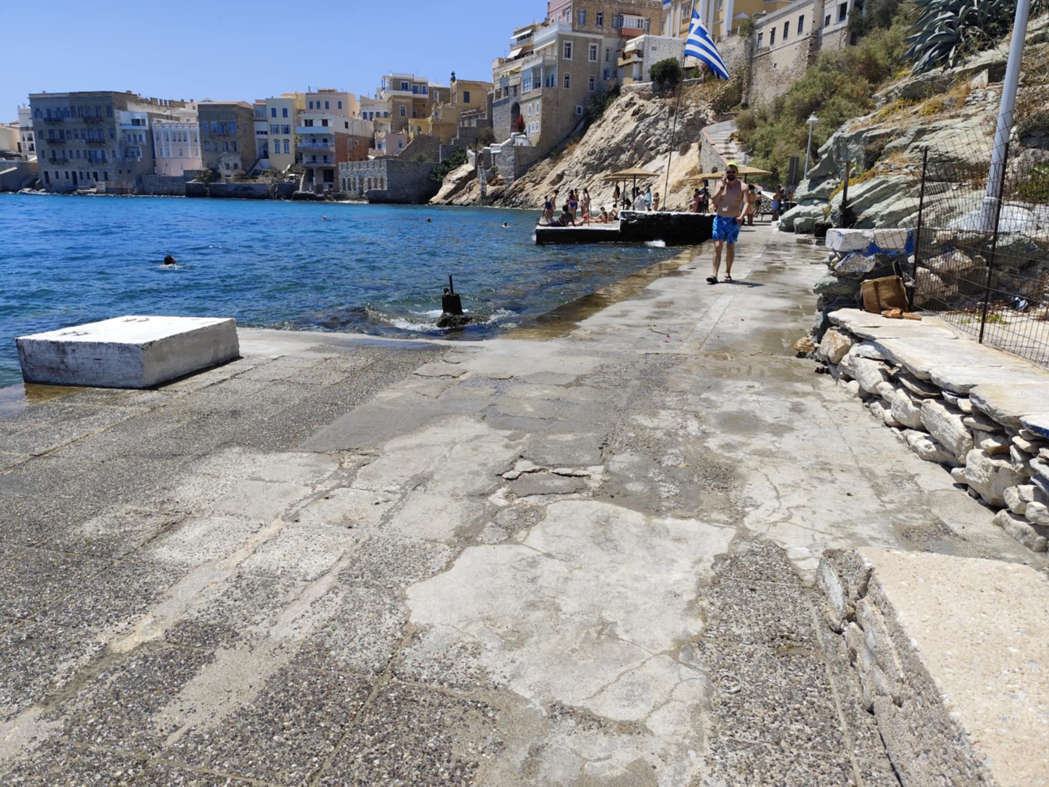 Μόλις τις τελευταίες ημέρες, η εργολαβία του Λιμενικού Ταμείου Σύρου, αποκατέστησε ορισμένα τμήματα, ρίχνοντας τσιμέντο, ώστε οι λουόμενοι να περπατούν με ασφάλεια. Ωστόσο, από πλευράς διοίκησης, αλλά και όπως αποδεικνύεται από το νέο φωτογραφικό υλικό που ελήφθη χθες, διευκρινίστηκε πως οι αποκαταστάσεις προχωρούν τμηματικά και αναλόγως των καιρικών συνθηκών, καθώς δεν μπορούν να γίνουν επιστρώσεις με αυξημένο κυματισμό, ούτε όμως και με κόσμο στην “πλαζ”.