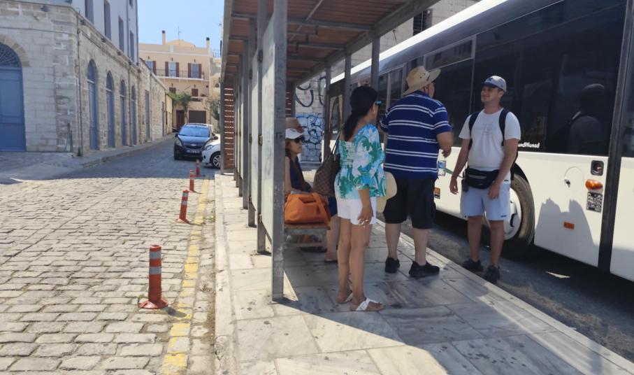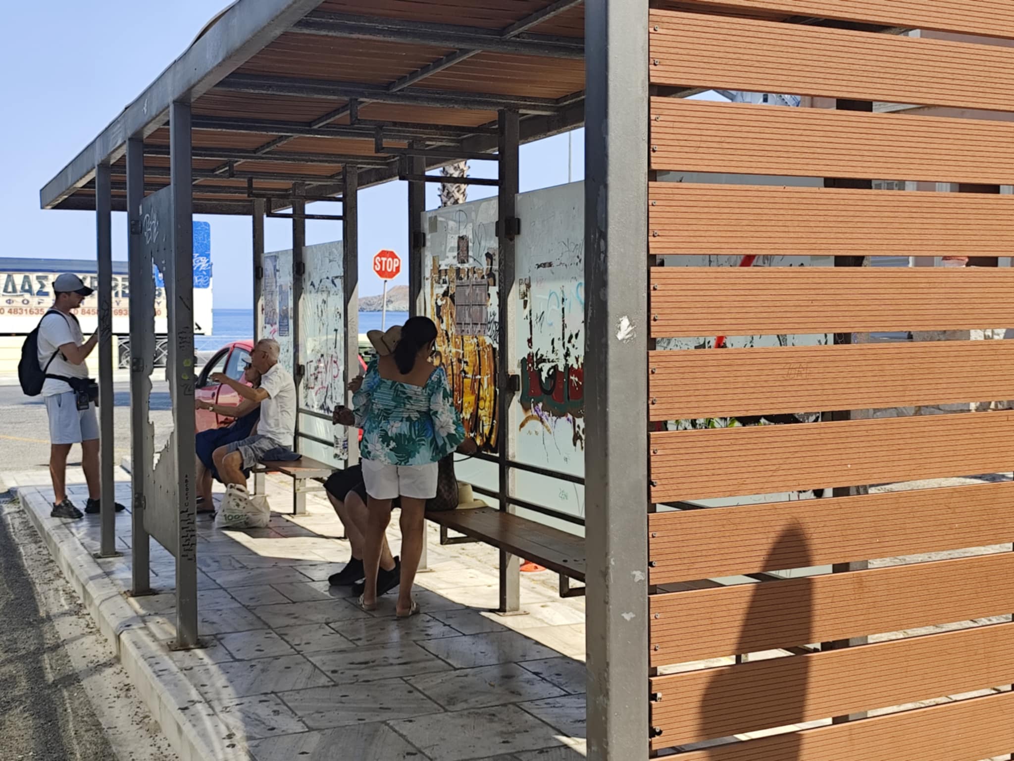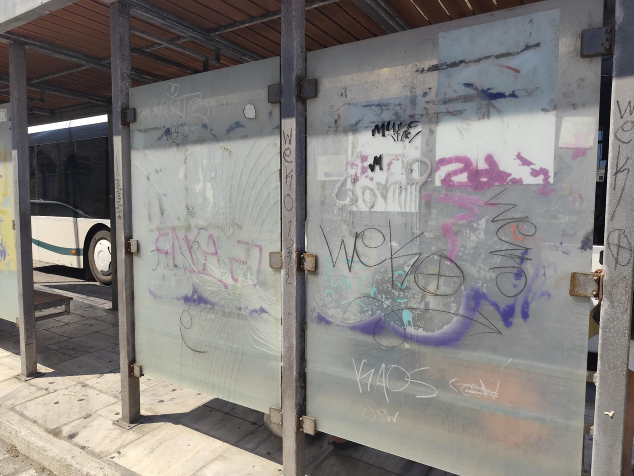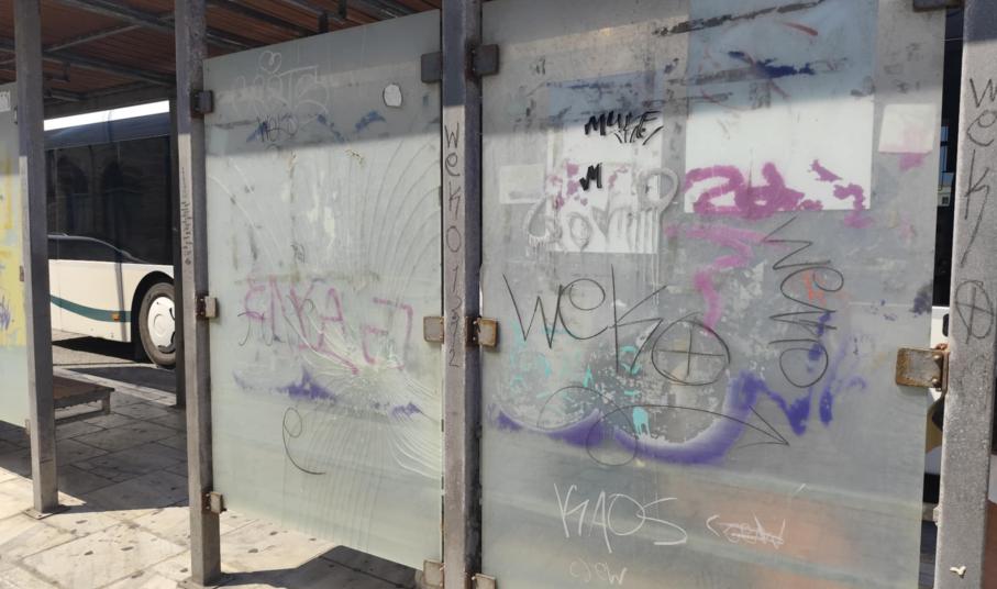 Σε κάκιστη κατάσταση έχει περιέλθει αισθητικά η στάση των επιβατών των ΚΤΕΛ Σύρου, στην Ερμούπολη, με ό,τι αυτό συνεπάγεται για την εικόνα που εισπράττουν οι ίδιοι για το νησί, κατά την αναμονή τους για τα λεωφορεία.