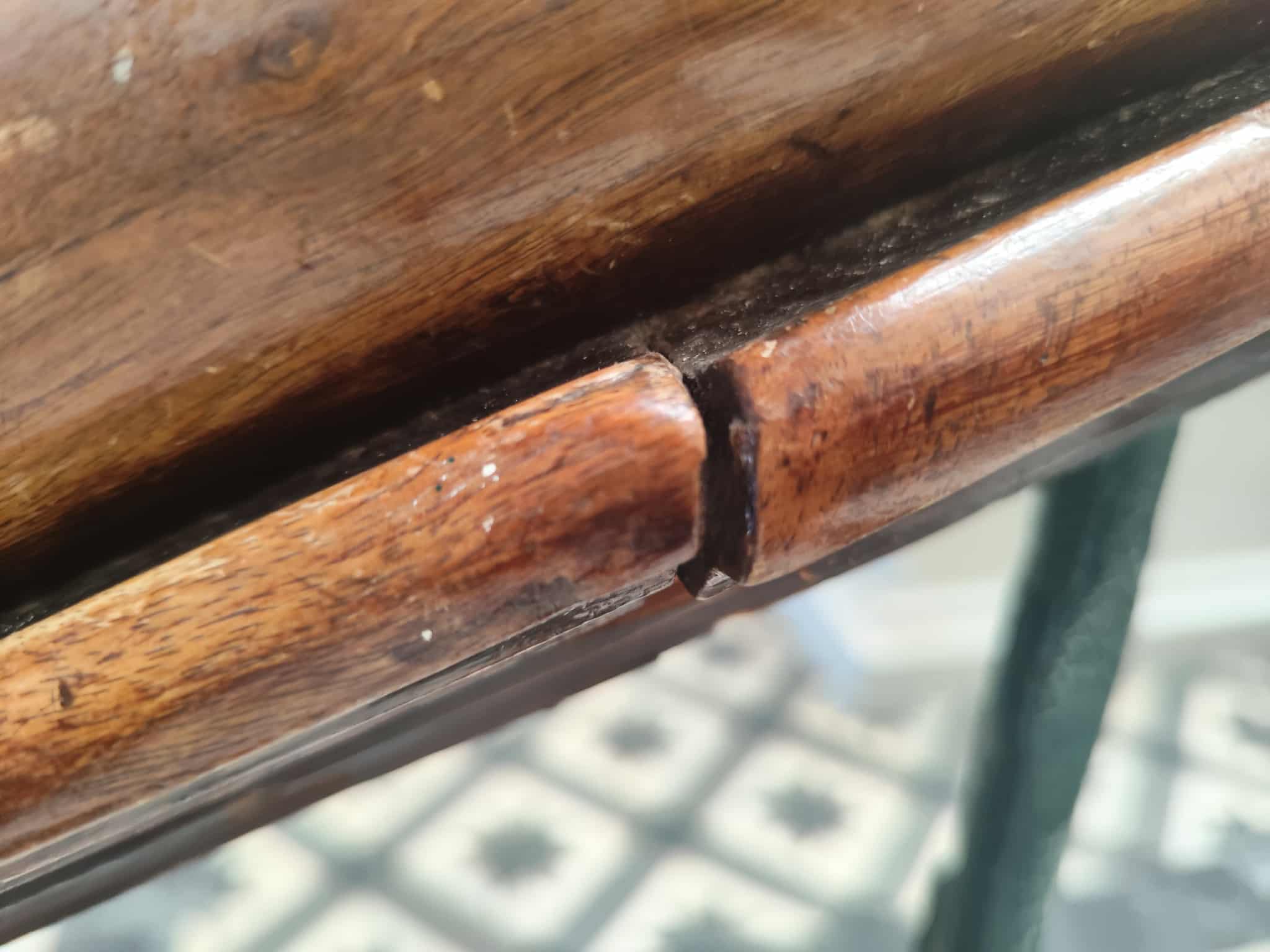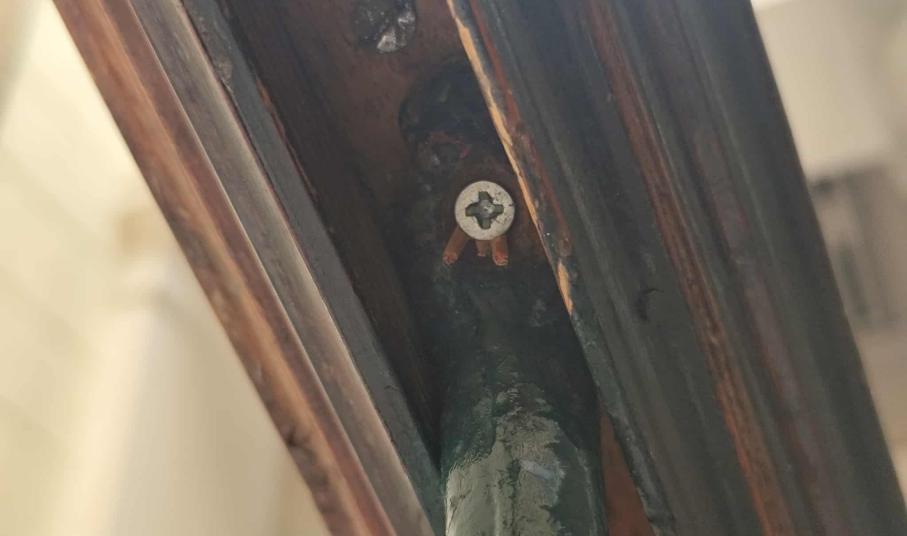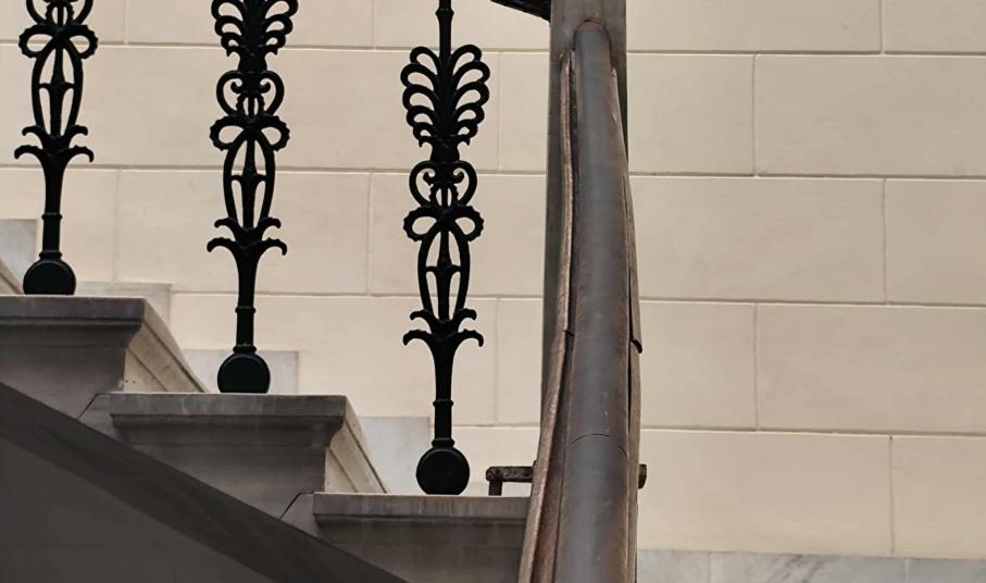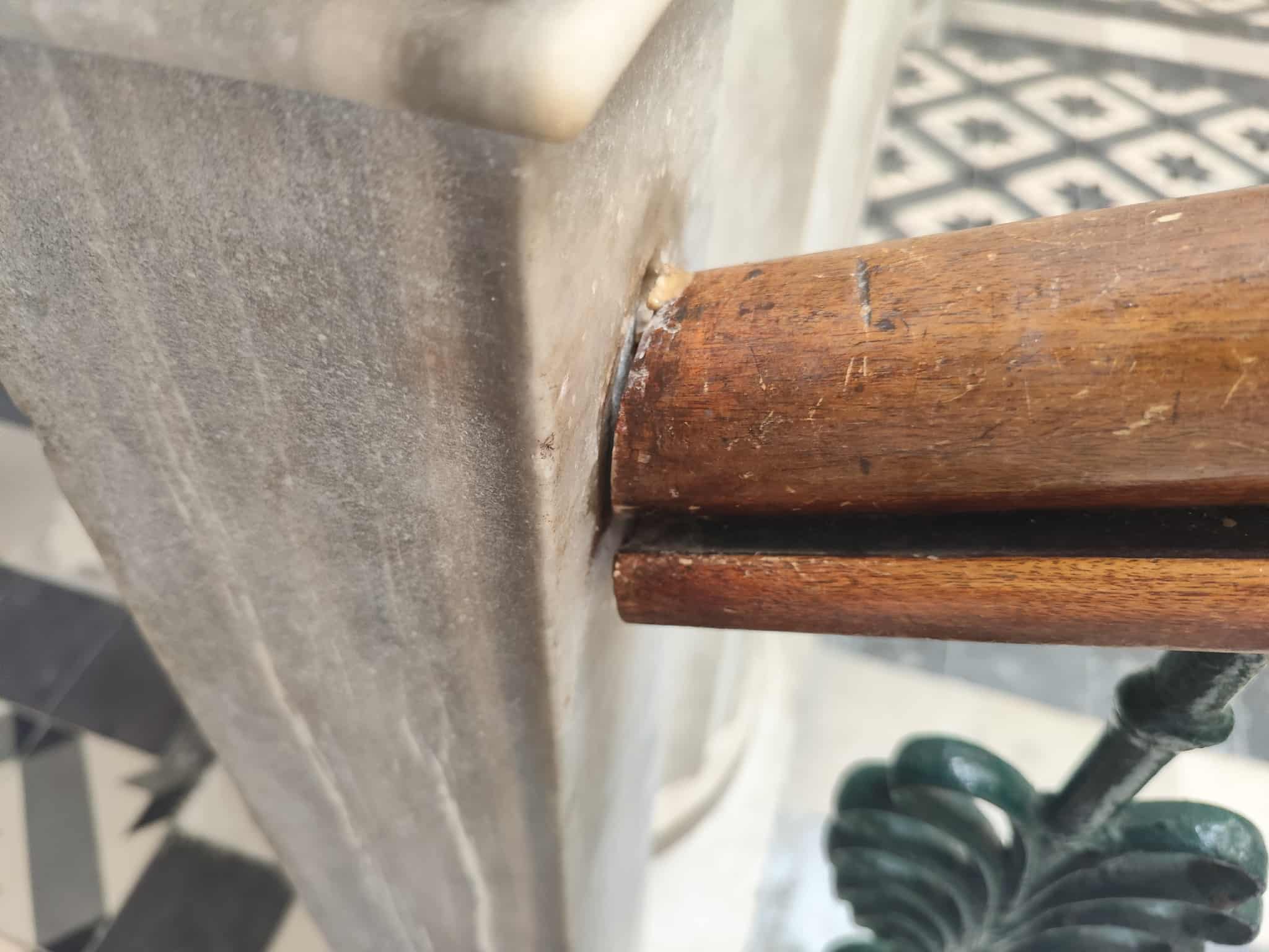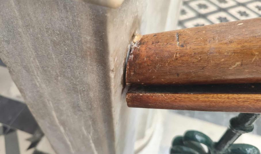 Σύμφωνα με όσα φαίνονται στο φωτογραφικό υλικό, τα τμήματα της ξύλινης κουπαστής έχουν αποκολληθεί μεταξύ τους, ενώ ορισμένα είναι σπασμένα, όπως επίσης, αν και έχουν τοποθετηθεί τρεις νέες βίδες, κάτω από την κουπαστή, στο σύνολό τους, οι υπόλοιπες δεν είναι ικανές να κρατήσουν στη θέση του, το κάγκελο. Επιπλέον, η κουπαστή έχει κυρτώσει.