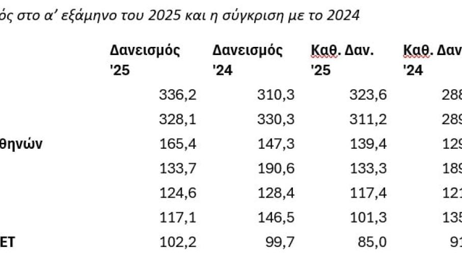 Σύμφωνα με την επεξεργασία των στοιχείων σε 71 εισηγμένες της Κύριας Αγοράς, οι οποίες δεν συμπεριλαμβάνονται στους δείκτες Υψηλής και Μεσαίας Κεφαλαιοποίησης του Χ.Α., ο συνολικός δανεισμός για το α’ εξάμηνο του 2025 (συμπεριλαμβανομένων και των υποχρεώσεων μίσθωσης) ανέρχεται σε 2,615 δισ. ευρώ και είναι μειωμένος κατά -5,6% ή κατά -157 εκατ. ευρώ σε σχέση με την αντίστοιχη επίδοση στο τέλος του 2024 (2,773 δισ. ευρώ).