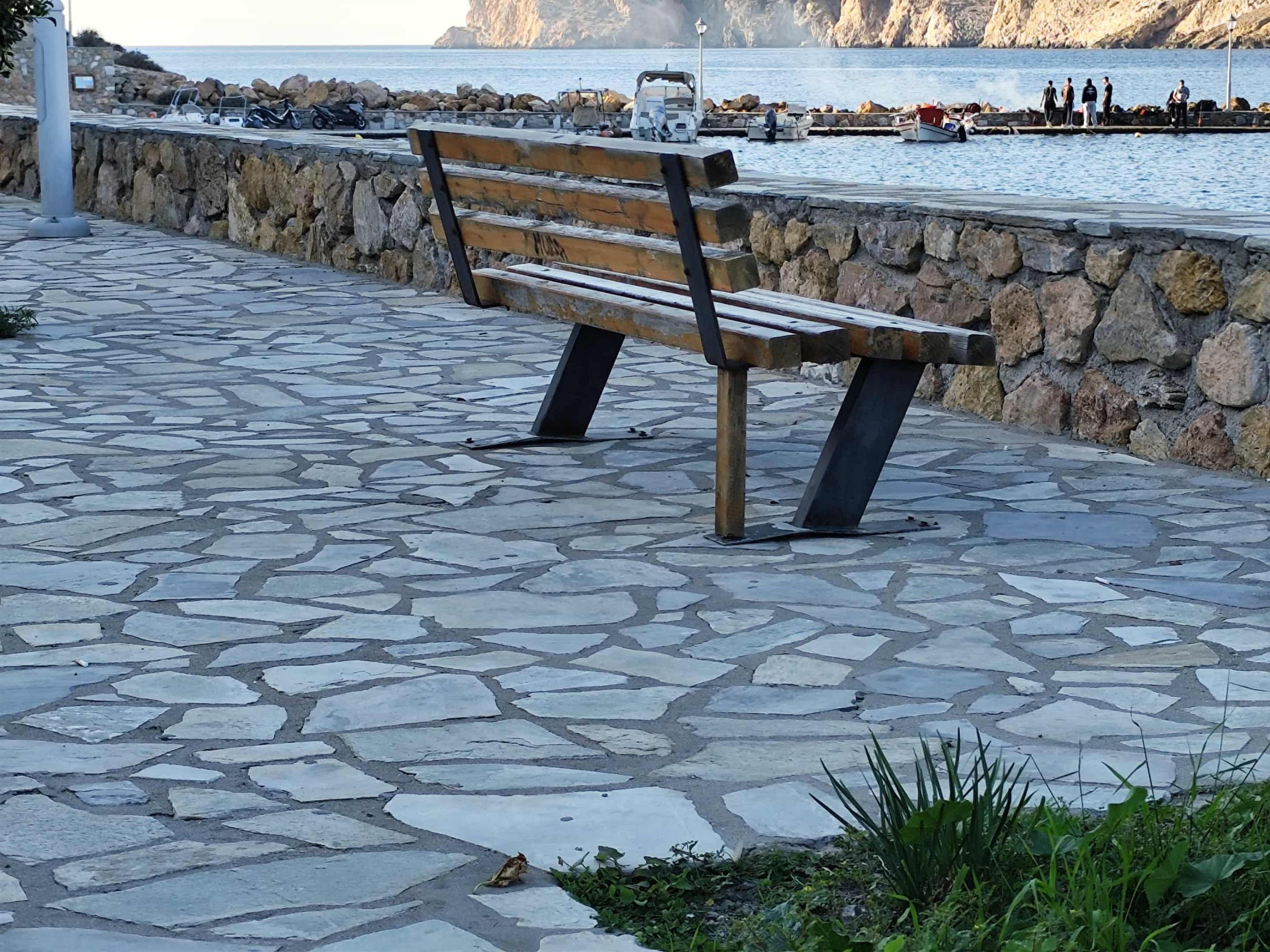 Για παράδειγμα, σε δύο από τα ξύλινα παγκάκια έχει αφαιρεθεί ένα βασικό ξύλο που πλαισίωνε την πλάτη, ενώ επίσης οι σιδερένιες βάσεις τους είναι σκουριασμένες, εξαιτίας της υγρασίας που υπάρχει στην περιοχή λόγω της θάλασσας.