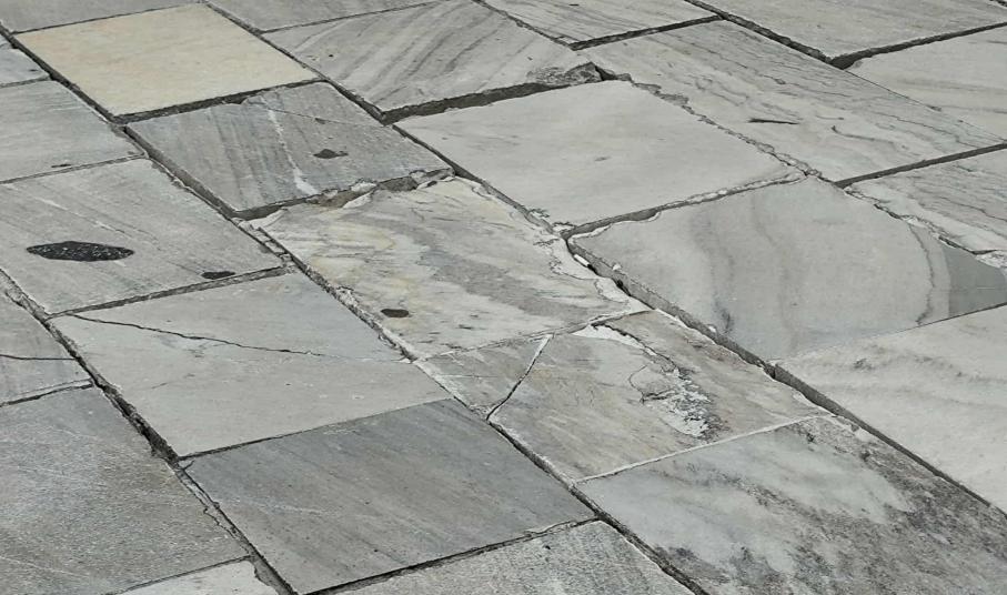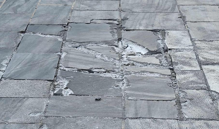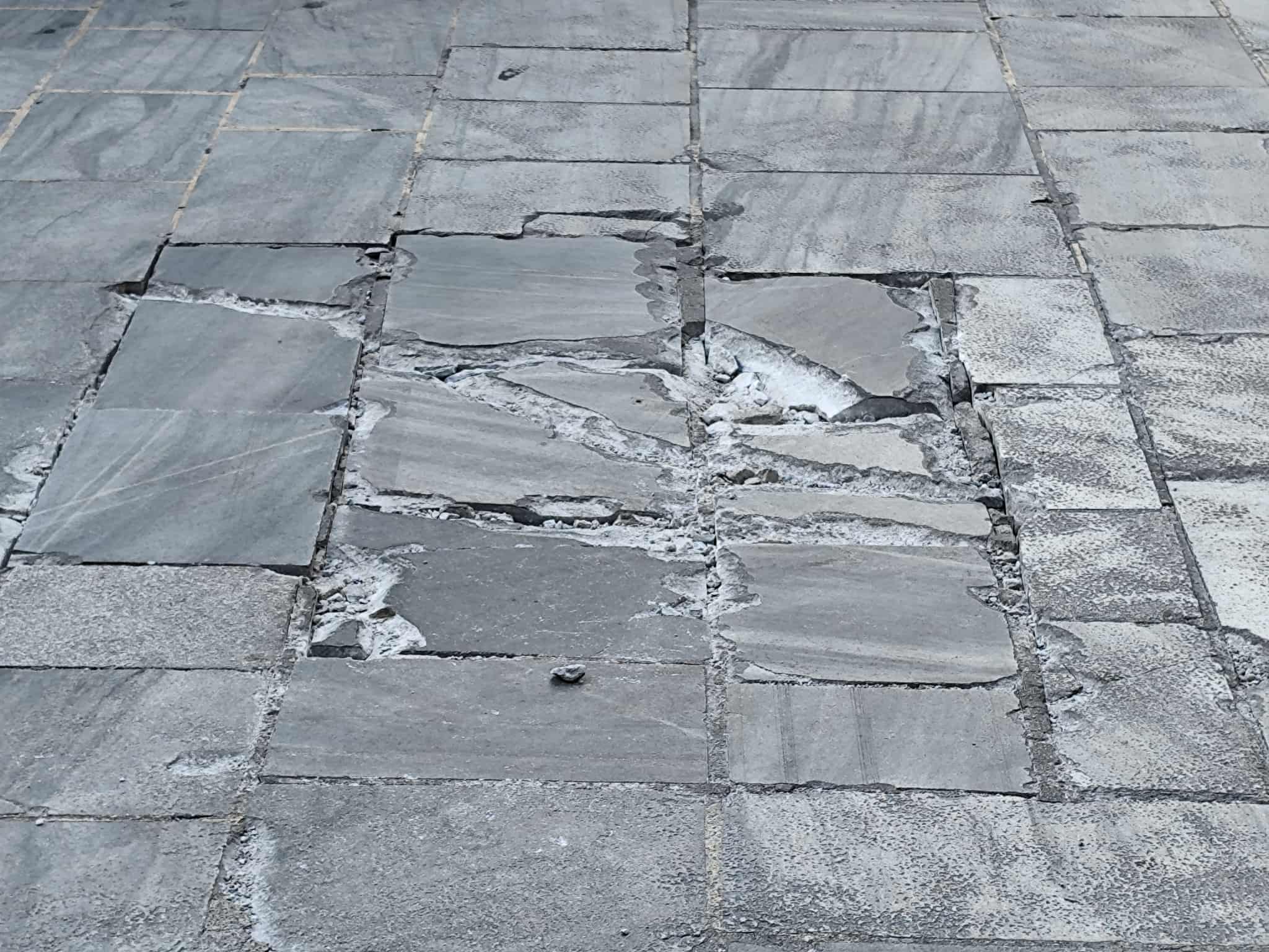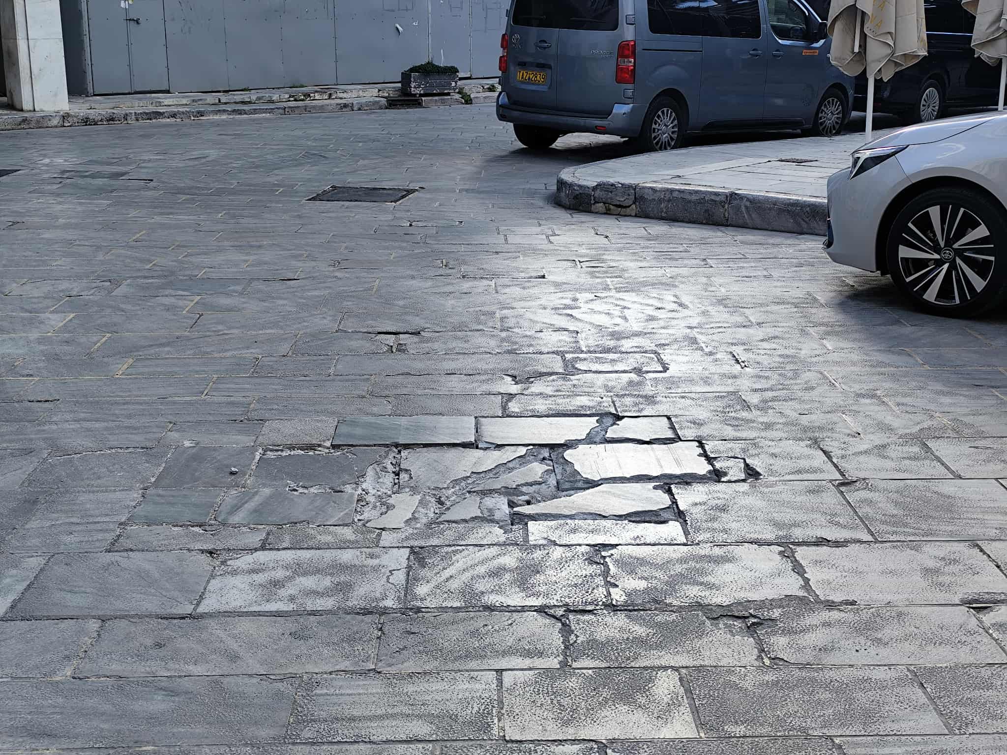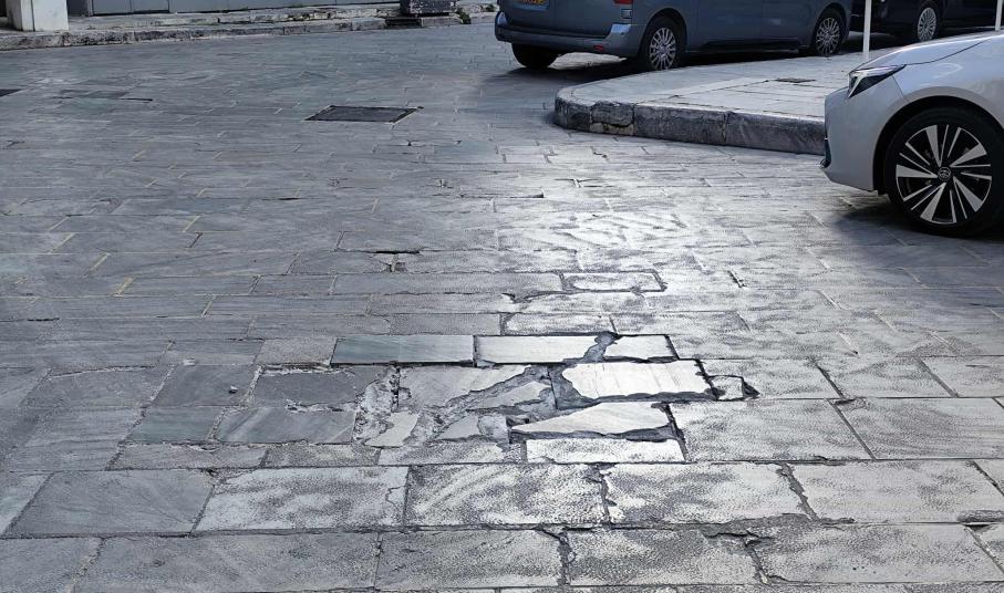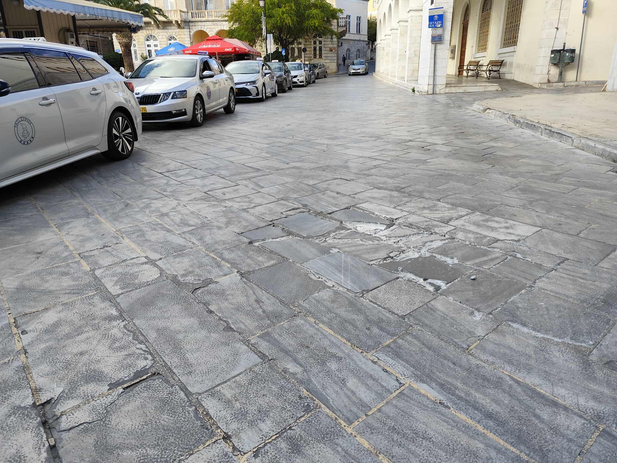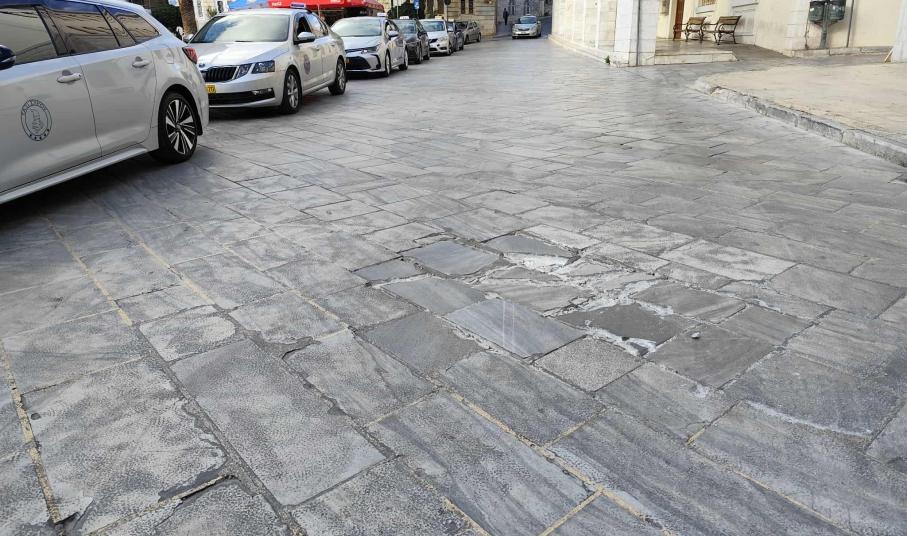 Σπασμένες ξανά οι πλάκες της κεντρικής οδού που σταθμεύουν τα ταξί στην πλατεία Μιαούλη