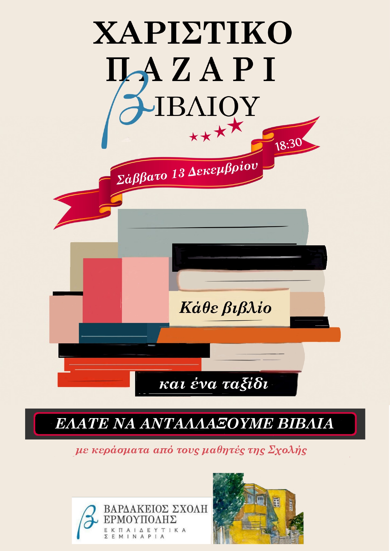 Το χαριστικό παζάρι της Βαρδακείου Σχολής επιστρέφει και πάλι. "Ελάτε να ανταλλάξουμε βιβλία το Σάββατο 13/12 από τις 18.30. Θα υπάρχουν κεράσματα των μαθητριών/τών μας και Χριστουγεννιάτικες δημιουργίες από τις μαθήτριες/τες των εργαστηρίων ραπτικής. Τα έσοδα θα δοθούν στη Στέγη Ανηλίκων", αναφέρει σε ανακοίνωση.