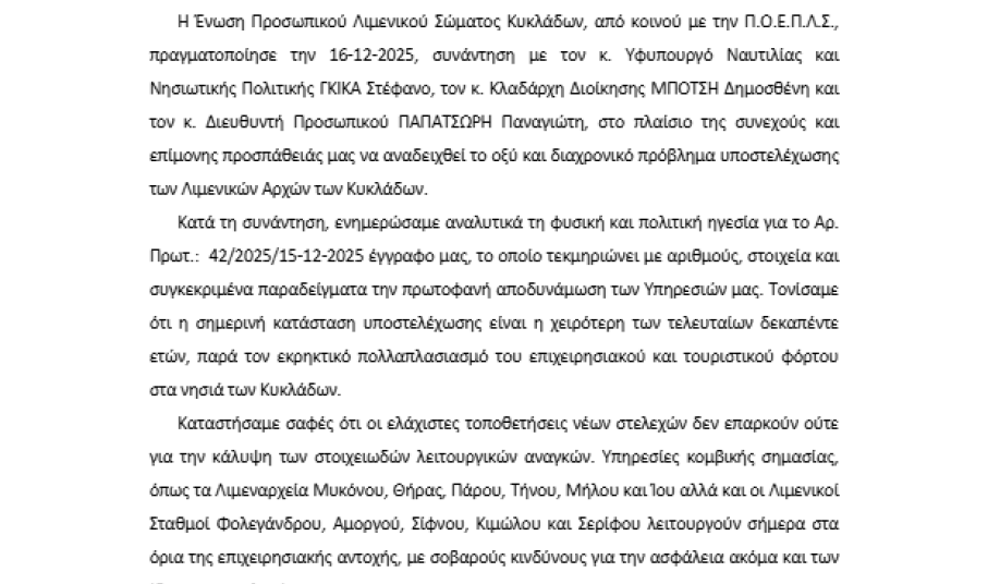 Κατά τη συνάντηση, ενημερώσαμε αναλυτικά τη φυσική και πολιτική ηγεσία για το Αρ. Πρωτ.: 42/2025/15-12-2025 έγγραφο μας, το οποίο τεκμηριώνει με αριθμούς, στοιχεία και συγκεκριμένα παραδείγματα την πρωτοφανή αποδυνάμωση των Υπηρεσιών μας. Τονίσαμε ότι η σημερινή κατάσταση υποστελέχωσης είναι η χειρότερη των τελευταίων δεκαπέντε ετών, παρά τον εκρηκτικό πολλαπλασιασμό του επιχειρησιακού και τουριστικού φόρτου στα νησιά των Κυκλάδων.