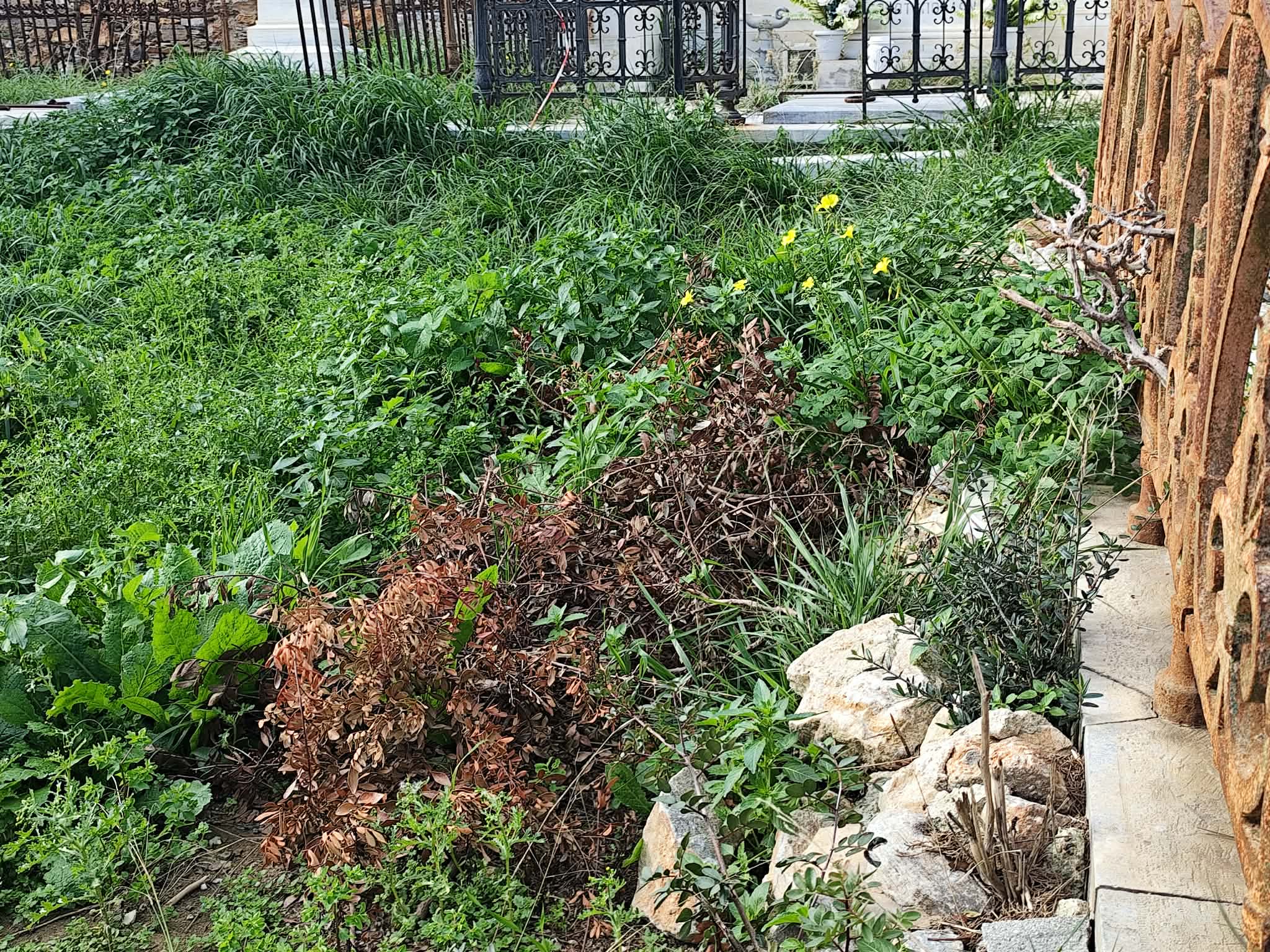 Συγκεκριμένα, με τις πρώτες μεγάλες βροχές, το πράσινο στον χώρο αναπτύχθηκε σημαντικά, με αποτέλεσμα να καλύψει διαδρόμους, αλλά ακόμη και μαρμάρινα μέρη των μαυσωλείων. Όπως φαίνεται από το φωτογραφικό υλικό, η γενική εικόνα παραπέμπει σε εγκατάλειψη, ως προς τις εργασίες αποψίλωσης και απομάκρυνσης των χόρτων, με αποτέλεσμα, περιπατητές που επισκέπτονται τα μαυσωλεία να επισημαίνουν την πλήρη αδιαφορία των αρμοδίων.