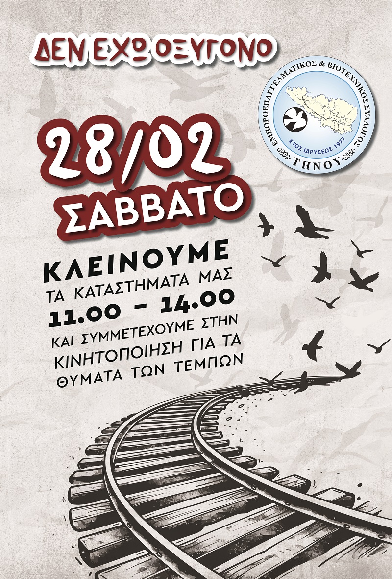 Κάλεσμα του Εμποροεπαγγελματικού Συλλόγου Τήνου για κινητοποίηση, αύριο, 28 Φεβρουαρίου σχετικά με τα τρία χρόνια από το τραγικό δυστύχημα των Τεμπών.