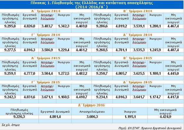 Βάσει των στοιχείων της τελευταίας έρευνας εργατικού δυναμικού της ΕΛ.ΣΤΑΤ. για το Α’ Τρίμηνο του 2016, προκύπτουν τα εξής: