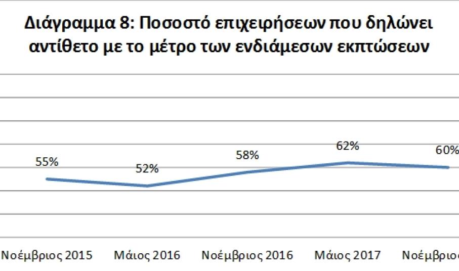 Σε ακόμα μία εποχική έρευνα της ΕΣΕΕ αποτυπώνεται η δυσαρέσκεια του εμπορικού κόσμου προς το μέτρο των ενδιάμεσων εκπτώσεων. Συγκεκριμένα το 60% των επιχειρηματιών είναι αντίθετο προς αυτό και το 35% εκφράζει τη σύμφωνη γνώμη του.
