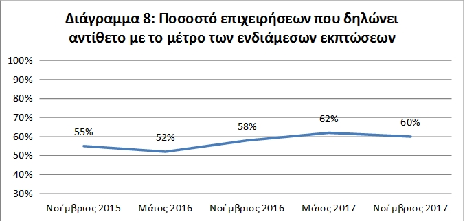 Μετά την πτώση που παρατηρήθηκε το Μάιο του 2017, όσον αφορά στο ποσοστό των επιχειρήσεων που συμμετέχουν στα εκπτωτικά δεκαήμερα, η συμμετοχή των εμπορικών επιχειρήσεων στην ενδιάμεση εκπτωτική φθινοπωρινή περίοδο του 2017