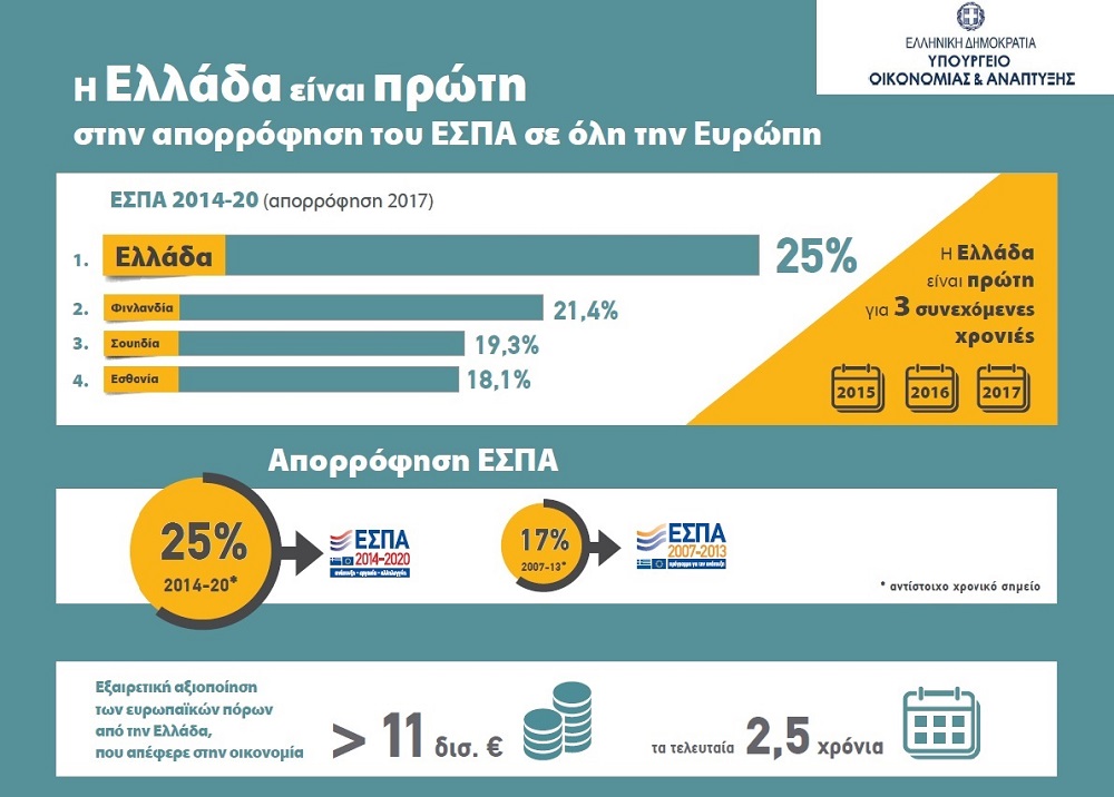 Συγκεκριμένα η Ελλάδα βρέθηκε στην πρώτη θέση απορρόφησης του ΕΣΠΑ 2014 - 2020 τις χρονιές 2015, 2016, 2017, ενώ το ποσοστό της για τη χρονιά που φεύγει αγγίζει το 25%, με δεύτερη τη Φιλανδία με 21,4%, ενώ ακολουθούν Σουηδία και Εσθονία με 19,3% και 18,1% αντίστοιχα. Σημειώνεται επίσης ότι στο αντίστοιχο χρονικό σημείο για το ΕΣΠΑ 2007 – 2013 το ποσοστό απορρόφησης της χώρας ήταν μόλις 17%, δηλαδή 8 μονάδες κάτω από το τωρινό.