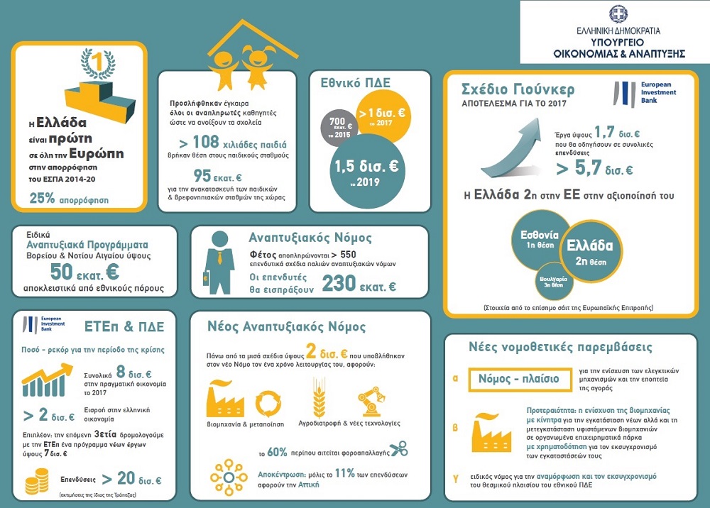 Αναφορικά με το σχέδιο Γιούνκερ και τα στοιχεία της Ευρωπαϊκής Τράπεζας Επενδύσεων η Ελλάδα βρίσκεται στη 2η θέση ανάμεσα στις Εσθονία (1η θέση) και Βουλγαρία (3η θέση) με έργα ύψους 1,7 δισεκατομμυρίων ευρώ τα οποία θα οδηγήσουν σε επενδύσεις 5,7 δισεκατομμυρίων ευρώ. Ειδικά αναπτυξιακά προγράμματα Βορείου & Νοτίου Αιγαίου που ανήλθαν στα 50 εκατομμύρια ευρώ χρηματοδοτήθηκαν αποκλειστικά από εθνικούς πόρους, ενώ σε ό,τι αφορά τον αναπτυξιακό νόμο φέτος αποπληρώνονται 550 επενδυτικά σχέδια παλιών αντίστοιχων με τους επενδυτές να εισπράττουν 230 εκατομμύρια ευρώ. Αντίστοιχα στο νέο αναπτυξιακό νόμο ο οποίος λειτουργεί εδώ και ένα χρόνο, έχει υποβληθεί μεγάλος αριθμός σχεδίων, περίπου τα μισά εκ των οποίων και ύψους 2 δισεκατομμυρίων ευρώ αφορούν τους τομείς της βιομηχανίας & μεταποίησης καθώς και την αγροδιατροφή & τις νέες τεχνολογίες. Από αυτά τα σχέδια περίπου το 60% αιτείται φοροαπαλλαγής, ενώ πραγματοποιήθηκε και σημαντική αποκέντρωση με μόλις το 11% αυτών να αφορά το νομό Αττικής.