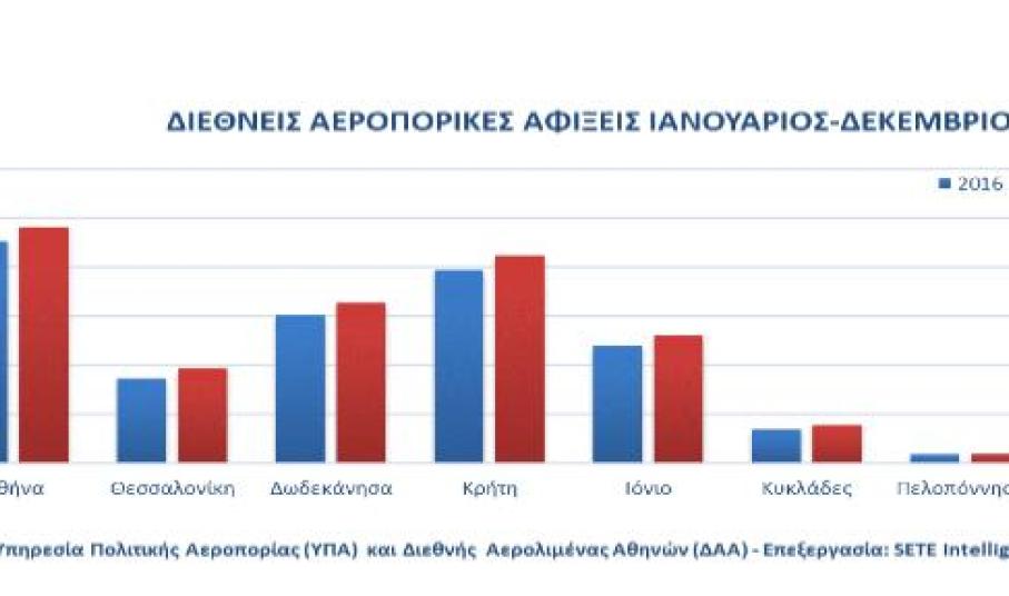 Αύξηση +8,6% των διεθνών αεροπορικών αφίξεων παρατηρήθηκε συνολικά την περίοδο Ιανουαρίου-Δεκεμβρίου του 2017 σε σχέση με την αντίστοιχη περίοδο του 2016. Συγκεκριμένα καταγράφηκαν 18,3 εκατ. αεροπορικές αφίξεις έναντι 16,9 εκατ. το 2016.