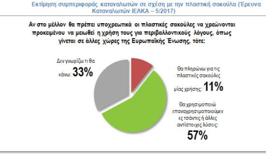Τα στοιχεία επίσης καταγράφουν αύξηση στις πωλήσεις τσαντών πολλαπλών χρήσεων άνω του 5.000%. Πρακτικά αυτή η αύξηση εκτιμάται ότι σημαίνει περίπου 2,5-3 εκατ. νέες τσάντες πολλαπλών χρήσεων στην αγορά και πάνω από 2 στα 3 νοικοκυριά να επιλέγουν αυτή τη λύση για τις αγορές του, έναντι της πληρωμής για πλαστική σακούλα μίας χρήσης. Τα στοιχεία αυτά συνάδουν και με τις εκτιμήσεις του κοινού όπως καταγράφηκαν στη σχετική έρευνα καταναλωτών του ΙΕΛΚΑ.