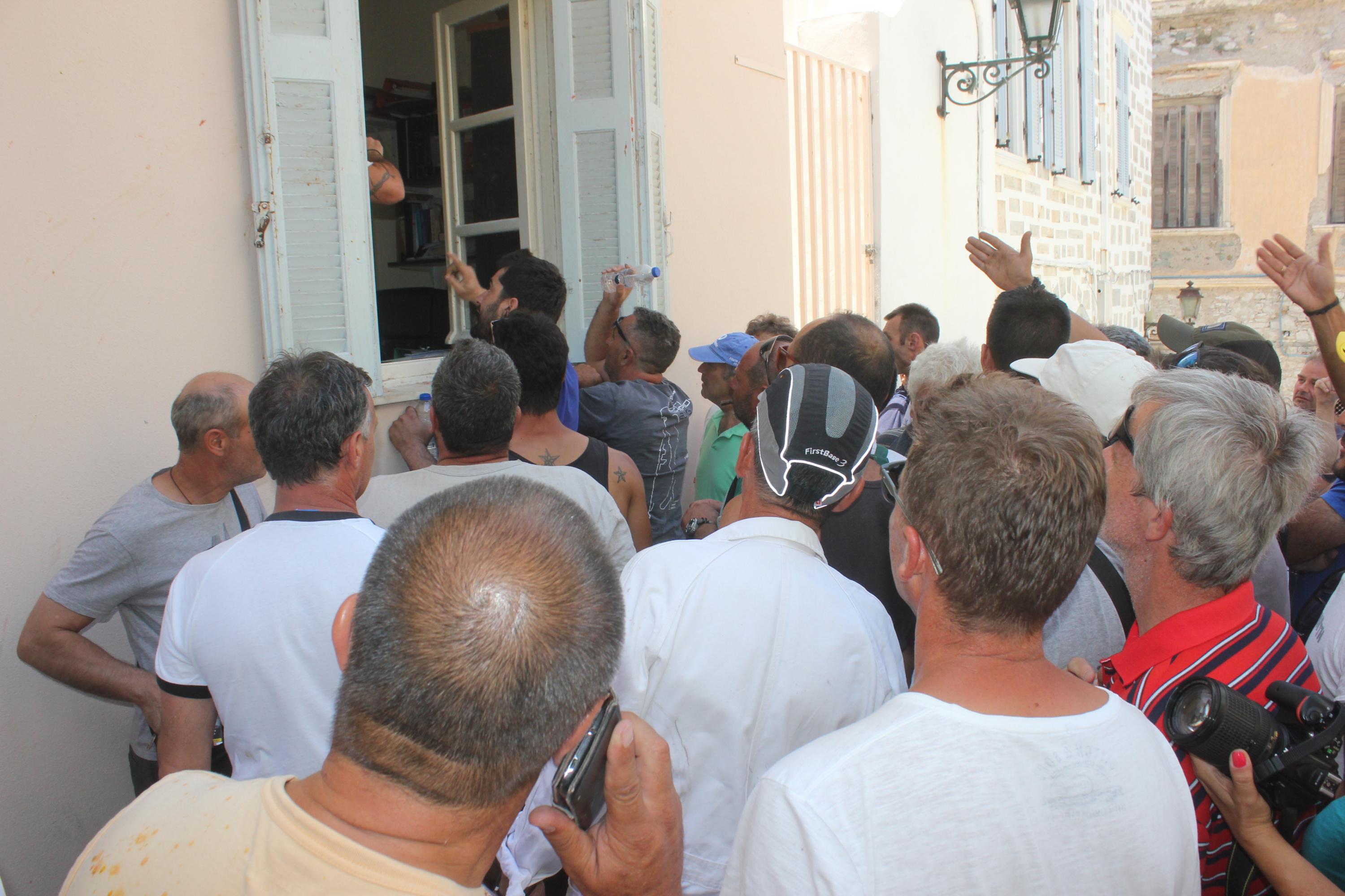 “Ο κόσμος περίμενε υπομονετικά τρεις ώρες έξω για το απλό” πρόσθεσε, σημειώνοντας πως η ρίψη ντοματών και νερού “έγινε όταν άρχισε να βρίζει ο δικηγόρος του κ. Ταβουλάρη τη δικηγόρο μας και προκλητικά να διώχνει όλους έξω από τα γραφείο λες και ήταν δικό του γραφείο”. Θέλησε να συμπληρώσει δε, πως, ενόχλησε τους εργαζομένους η εικόνα “να υπερασπίζεται ουσιαστικά τους 14 και ο Σίσκος (σσ. Επιθεωρητής) και να λέει δεν υπογράφω”.
