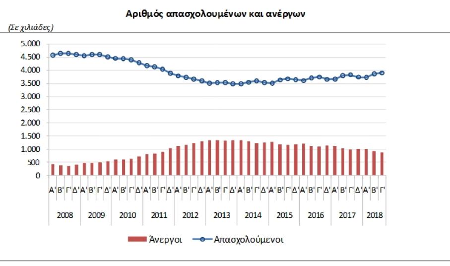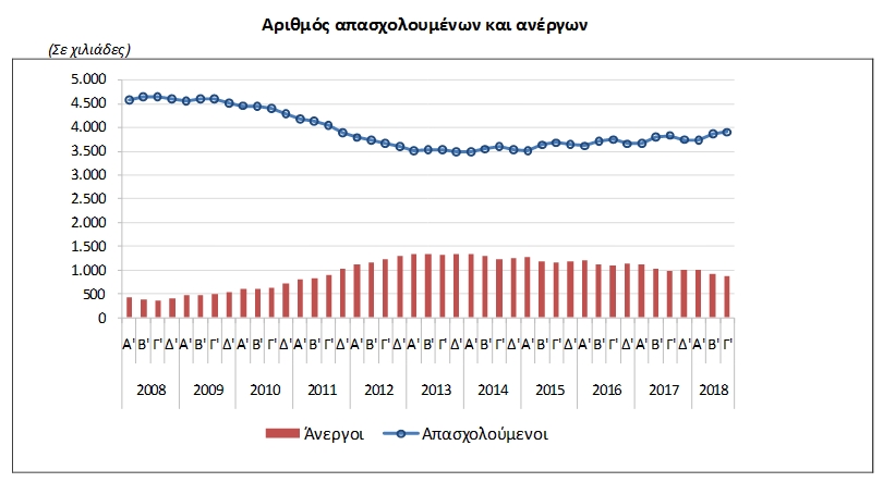 Το ποσοστό ανεργίας ήταν 18,3%, έναντι 19,0% του προηγούμενου τριμήνου (B΄ τρίμηνο του 2018) και 20,2% το αντίστοιχο τρίμηνο του προηγούμενου έτους (Γ΄ τρίμηνο 2017).