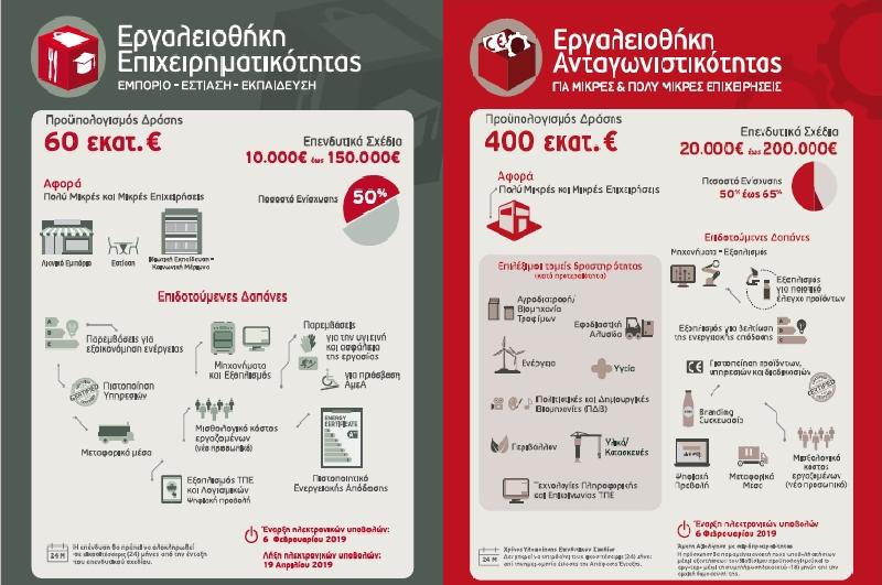 Η δεύτερη δράση που προκηρύσσεται είναι η «Εργαλειοθήκη Επιχειρηματικότητας, Εμπόριο-Εστίαση-Εκπαίδευση», με προϋπολογισμό 60 εκατ. ευρώ. Η Δράση στοχεύει στην ενίσχυση υφιστάμενων μικρών και πολύ μικρών επιχειρήσεων που δραστηριοποιούνται α) στο λιανικό εμπόριο, β) στην παροχή υπηρεσιών εστίασης και γ) στην παροχή υπηρεσιών ιδιωτικής εκπαίδευσης προκειμένου να αναβαθμίσουν το επίπεδο επιχειρησιακής οργάνωσης και λειτουργίας τους. Στο πλαίσιο αυτό ενισχύονται επενδυτικά σχέδια για παρεμβάσεις εξοικονόμησης ενέργειας, αναβάθμισης της υγιεινής και ασφάλειας της εργασίας και ενίσχυσης της εφοδιαστικής αλυσίδας. Υποβάλλονται επενδυτικά σχέδια από 10.000 € έως 150.000 € με επιδότηση μέχρι 50%.