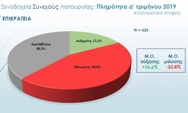 Σύμφωνα με την Έρευνα, με τίτλο: «Επιδόσεις ξενοδοχείων κατά το α’ τρίμηνο και προβλέψεις για την τουριστική σεζόν 2019» - που πραγματοποιήθηκε σε δείγμα 1956 ελληνικών ξενοδοχείων σε σύνολο 9.873 - το 45% των μονάδων συνεχούς λειτουργίας παρουσίασε μειωμένη πληρότητα, ενώ 1 στα 4 ξενοδοχεία εμφάνισε μείωση στις τιμές του.