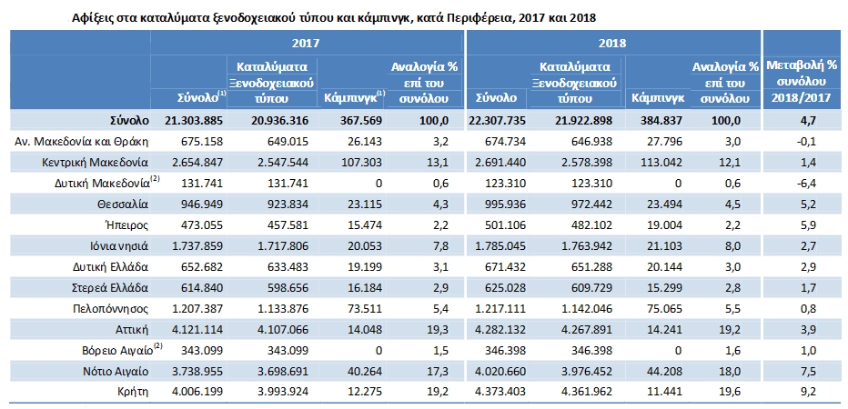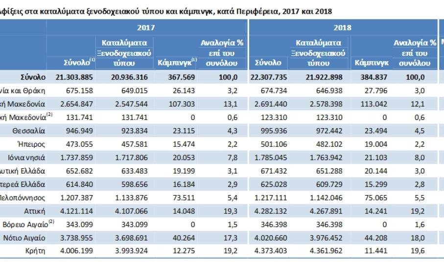 Από τα στοιχεία της Έρευνας Κίνησης Καταλυμάτων Ξενοδοχειακού Τύπου και Κάμπινγκ, που διενεργείται από την ΕΛΣΤΑΤ, προκύπτει ότι, κατά το έτος 2018, στο σύνολο των καταλυμάτων αυτών παρουσιάζεται αύξηση στις αφίξεις κατά 4,7% και στις διανυκτερεύσεις κατά 2,6% σε σχέση με τα αντίστοιχα στοιχεία του έτους 2017.