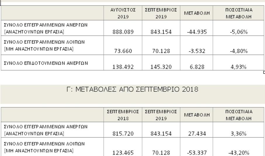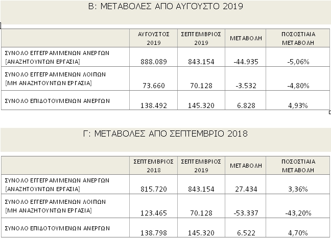 Το σύνολο των εγγεγραμμένων ανέργων, με κριτήριο την αναζήτηση εργασίας (αναζητούντων εργασία), για τον μήνα Σεπτέμβριο 2019, ανήλθε σε 843.154 άτομα. Από αυτά 478.430 (ποσοστό 56,74%) είναι εγγεγραμμένα στο μητρώο  του ΟΑΕΔ για χρονικό διάστημα ίσο ή και περισσότερο των 12 μηνών και 364.724 (ποσοστό 43,26%) είναι εγγεγραμμένα στο μητρώο του ΟΑΕΔ για χρονικό διάστημα μικρότερο των 12 μηνών. Οι άνδρες ανέρχονται σε 298.189 (ποσοστό 35,37%) και οι  γυναίκες ανέρχονται σε 544.965  (ποσοστό 64,63%).