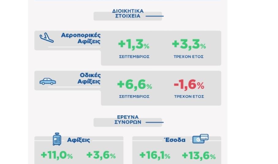 Σύμφωνα με τα διαθέσιμα στοιχεία από τα κυριότερα αεροδρόμια της χώρας, οι διεθνείς αεροπορικές αφίξεις που καταγράφηκαν τον Σεπτέμβριο του 2019, ήταν αυξημένες κατά +1,3%/+39 χιλ. σε σχέση με τον Σεπτέμβριο του 2018, ενώ συνολικά καταγράφηκαν 3,1 εκατ. διεθνείς αεροπορικές αφίξεις.