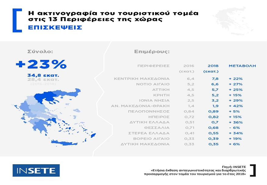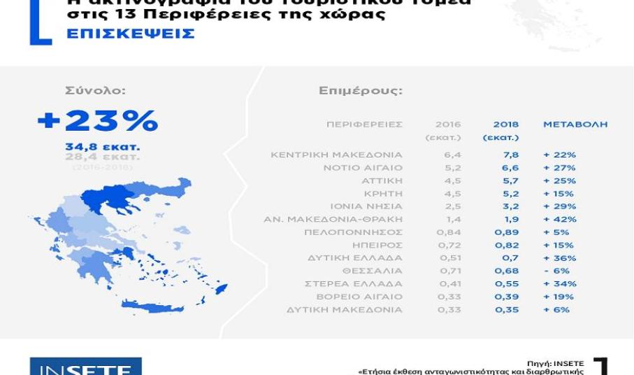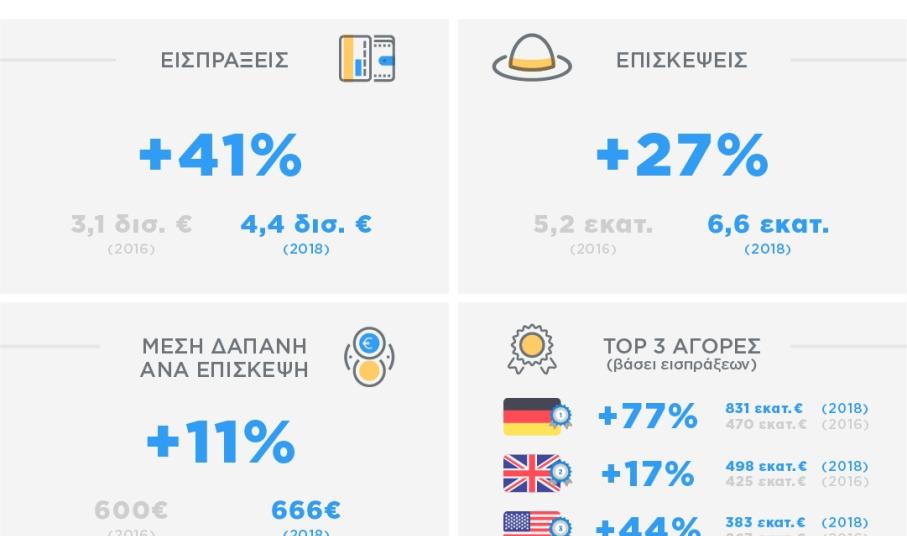 Σύμφωνα με τα στοιχεία των εκθέσεων, οι επισκέψεις στις 13 Περιφέρειες της χώρας την περίοδο 2016 – 2018 αυξήθηκαν κατά 23% (από 28,38 εκατ. σε 34,83 εκατ.). Αντίστοιχα, οι τουριστικές εισπράξεις στην Ελλάδα την ίδια περίοδο αυξήθηκαν κατά 23% (από 12,75 δισ. ευρώ το 2016 σε 15,65 δισ. ευρώ το 2018). Επίσης, η μέση δαπάνη ανά επίσκεψη στην Ελλάδα το 2018 διατηρήθηκε σχεδόν στα ίδια επίπεδα σε σχέση με το 2016, στα 449 ευρώ. Επιμέρους, η μέση δαπάνη κατέγραψε θετική μεταβολή σε 7 Περιφέρειες, ενώ παρουσίασε μείωση σε 6 Περιφέρειες.