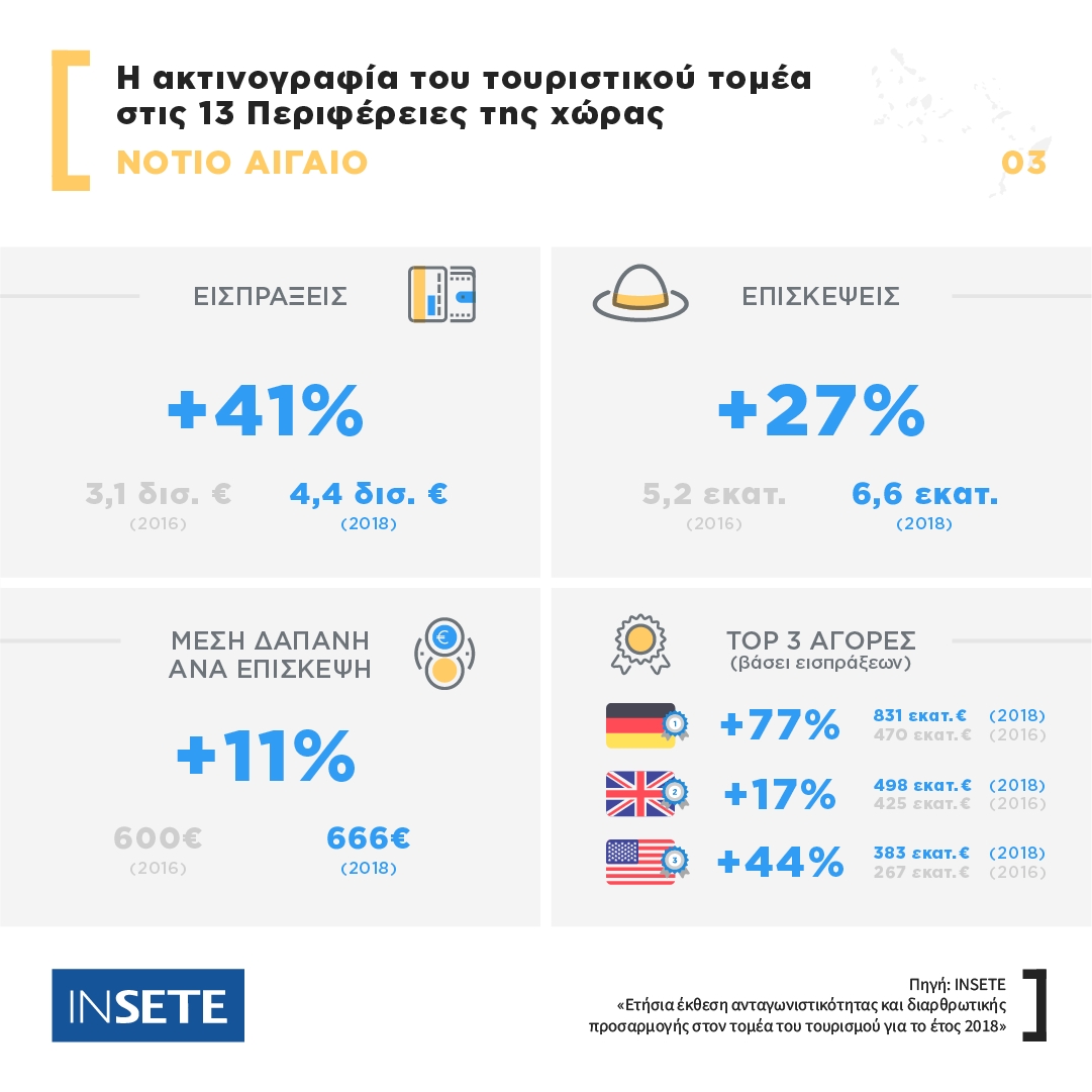 Η Περιφέρεια Νοτίου Αιγαίου αντιπροσωπεύει το 19% των επισκέψεων που καταγράφηκαν στις Περιφέρειες της Ελλάδας το 2018, σημειώνοντας αύξηση κατά 27% σε σύγκριση με το 2016 (από 5,2 εκατ. σε 6,6 εκατ.).