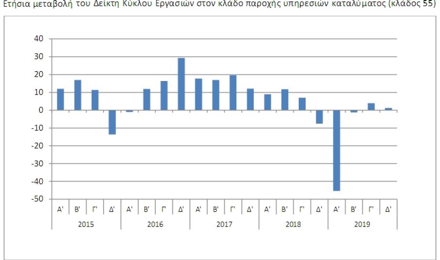 Ο Δείκτης Κύκλου Εργασιών στον κλάδο 55 του Δ ́ τριμήνου 2019, σε σύγκριση με τον αντίστοιχο δείκτη του Γ ́ τριμήνου 2019, παρουσίασε μείωση 80,3% έναντι μείωσης 79,7%, που σημειώθηκε κατά τη σύγκριση της αντίστοιχης περιόδου