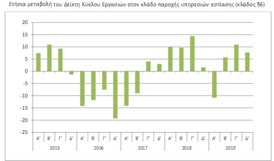 Ο Γενικός Δείκτης Κύκλου Εργασιών (κλάδοι 55 και 56) για το Δ ́ τρίμηνο του 2019 σε σύγκριση με τον αντίστοιχο δείκτη του Δ ́ τριμήνου 2018, παρουσίασε αύξηση 4,8% έναντι μείωσης 2,8%, που σημειώθηκε κατά τη σύγκριση της αντίστοιχης περιόδου του έτους 2018 προς το 2017.