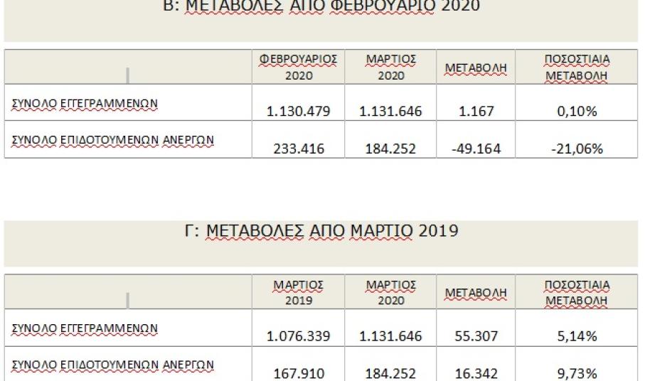 Το σύνολο των εγγεγραμμένων ανέργων, με κριτήριο την αναζήτηση εργασίας (αναζητούντων εργασία), για τον μήνα Μάρτιο 2020, ανήλθε σε 1.071.409 άτομα. Από αυτά 515.933 (ποσοστό 48,15%) είναι εγγεγραμμένα στο μητρώο του ΟΑΕΔ για χρονικό διάστημα ίσο ή και περισσότερο των 12 μηνών και 555.476 (ποσοστό 51,85%) είναι εγγεγραμμένα στο μητρώο του ΟΑΕΔ για χρονικό διάστημα μικρότερο των 12 μηνών. Οι άνδρες ανέρχονται σε 397.228 (ποσοστό 37,08%) και οι γυναίκες ανέρχονται σε 674.181 (ποσοστό 62,92%).