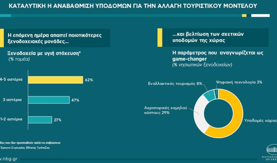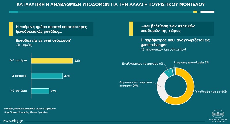 Από την πλευρά των επιχειρήσεων, χρειάζεται στρατηγική στόχευση για την αύξηση πολυτελών ξενοδοχείων, δεδομένου ότι οι μονάδες 4-5 αστέρων καλύπτουν 23% των ελληνικών ξενοδοχείων, έναντι 65% στη Μεσόγειο. Αξιοσημείωτο είναι ότι η τάση αναβάθμισης είναι ήδη εμφανής, καθώς οι συγκεκριμένες κατηγορίες σημείωσαν αύξηση 57% την τελευταία δεκαετία στην Ελλάδα (με διπλασιασμό των ξενοδοχείων 5 αστέρων), έναντι μείωσης 15% σε μονάδες 1-2 αστέρων. Τα πολυτελή ξενοδοχεία μπορούν να προσελκύσουν τουρίστες υψηλής δαπάνης ενώ παράλληλα παρουσιάζουν καλύτερες επιδόσεις από χαμηλότερης ποιότητας ξενοδοχεία. Συγκεκριμένα, φάνηκαν πιο ανθεκτικά στην τρέχουσα κρίση (με 62% του τομέα να έχει υγιή στόχευση, έναντι 27% για ξενοδοχεία 1-2 αστέρων), ενώ αναμένουν μικρότερη πτώση πωλήσεων το 2020 (35%, έναντι 50% για τα 1-2 αστέρων).