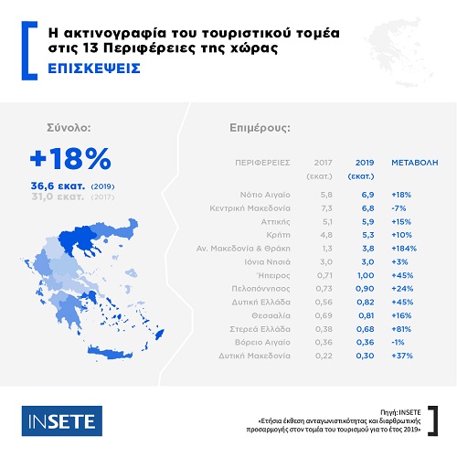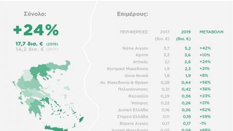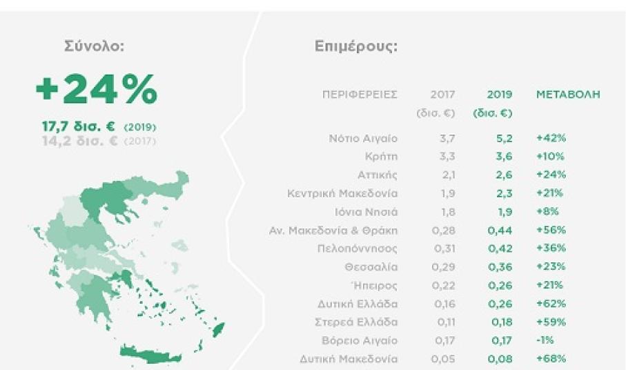 Σύμφωνα με τα στοιχεία των εκθέσεων, οι επισκέψεις στις 13 Περιφέρειες της χώρας την περίοδο 2017-2019 αυξήθηκαν κατά 18% (από 31 εκατ. σε 36,6 εκατ.). Αντίστοιχα, οι τουριστικές εισπράξεις στην Ελλάδα την ίδια περίοδο αυξήθηκαν κατά 24% (από 14,2 δισ. ευρώ το 2017 σε 17,7 δισ. ευρώ το 2019). Επίσης, η Μέση Δαπάνη ανά Επίσκεψη ανά Περιφέρεια στην Ελλάδα το 2019 αυξήθηκε κατά 5% σε σχέση με το 2017, στα 482 ευρώ. Επιμέρους, η Μέση Δαπάνη κατέγραψε θετική ποσοστιαία μεταβολή σε όλες τις Περιφέρειες, με εξαίρεση τη Στερεά Ελλάδα, την Ήπειρο και την Αν. Μακεδονία και Θράκη.