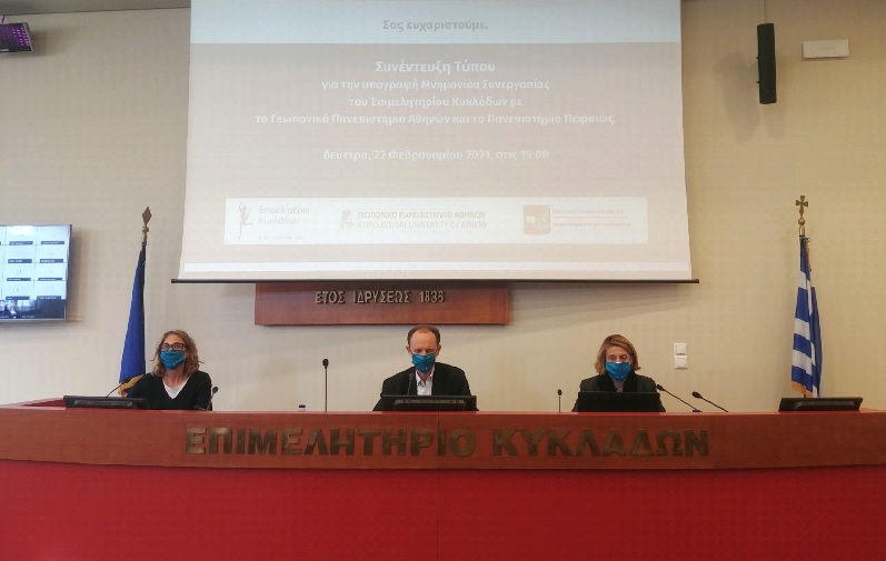 Συνέντευξη Τύπου μέσω διαδικτύου διοργάνωσε τη Δευτέρα 22 Φεβρουαρίου 2021 το Επιμελητήριο Κυκλάδων για την ανακοίνωση της υπογραφής Μνημονίων Συνεργασίας με το Γεωπονικό Πανεπιστήμιο Αθηνών και το Πανεπιστήμιο Πειραιώς.