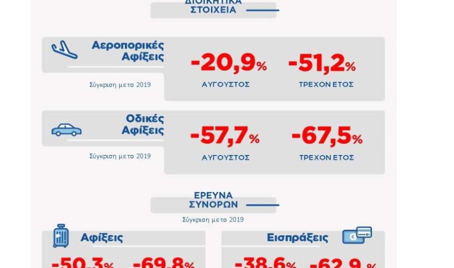 Τον Ιούλιο η ανάκαμψη ανήλθε σε -24,9%/-238 χιλ. ενώ καταγράφηκαν 716 χιλ. αφίξεις. Τέλος, τον Αύγουστο καταγράφηκαν 794 χιλ. αεροπορικές αφίξεις, με το ρυθμού ανάκαμψης να ανέρχεται σε -18,2% ή -176 χιλ. αφίξεις.