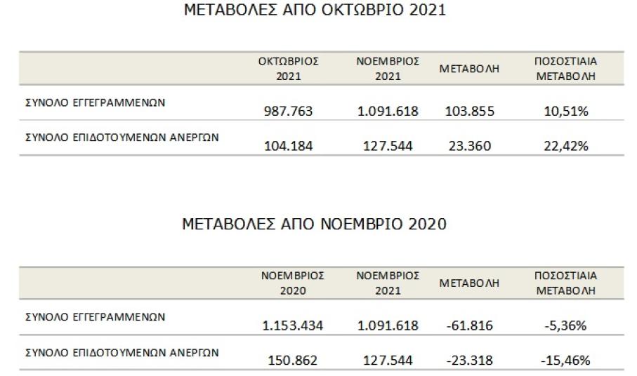 Το σύνολο των εγγεγραμμένων ανέργων, με κριτήριο την αναζήτηση εργασίας (αναζητούντων εργασία), για τον μήνα Νοέμβριο 2021, ανήλθε σε 1.081.622 άτομα. Από αυτά 584.634 (ποσοστό 54,05%) είναι εγγεγραμμένα στο μητρώο του ΟΑΕΔ για χρονικό διάστημα ίσο ή και περισσότερο των 12 μηνών και 496.988 (ποσοστό 45,95%) είναι εγγεγραμμένα στο μητρώο του ΟΑΕΔ για χρονικό διάστημα μικρότερο των 12 μηνών. Οι άνδρες ανέρχονται σε 389.993 (ποσοστό 36,06%) και οι γυναίκες ανέρχονται σε 691.629 (ποσοστό 63,94%).